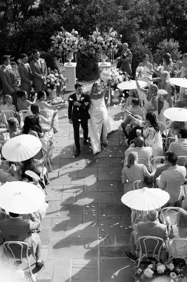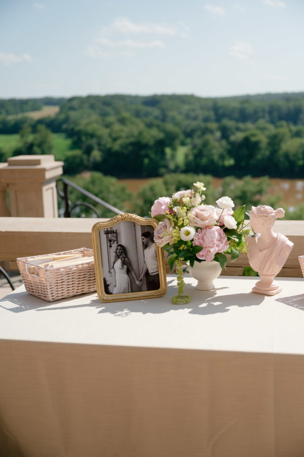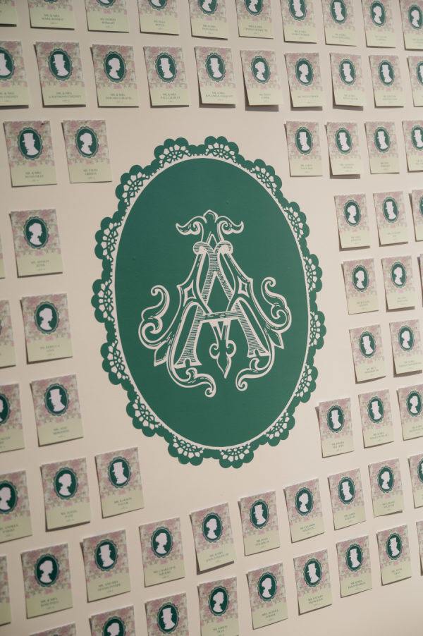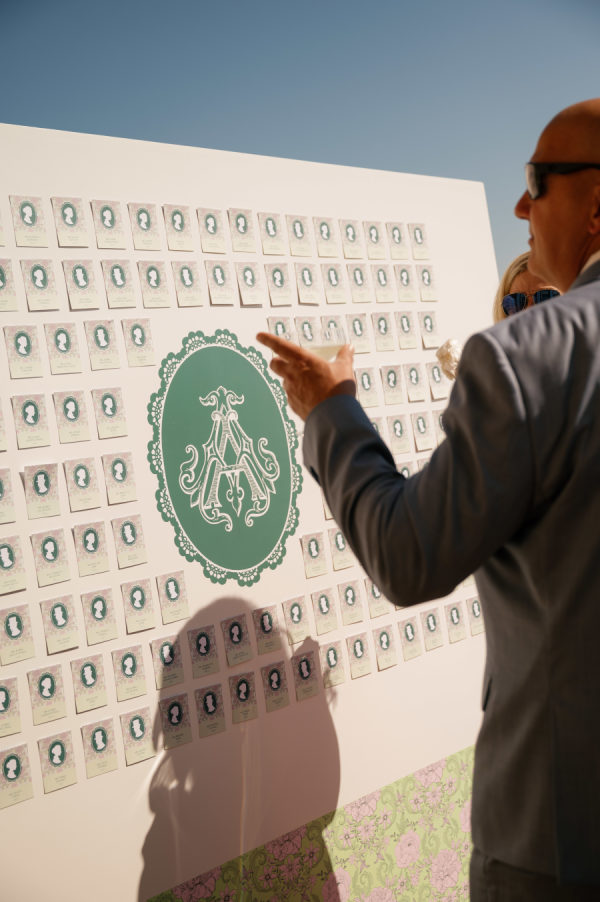 [field title=”Special Detail #3″]Alyssa and AJ’s signature monogram made a statement throughout the celebration- proof that personal touches make all the difference. From custom cocktail napkins, service towels, and matchbooks to a grand cameo-inspired seating display, every detail was thoughtfully curated. Grecian busts added an artful nod to the romantic setting, and parasols were offered for guests to create their own little moment of shade (and style). It was personalization done to perfection, with a wink of old-world charm.[/field]