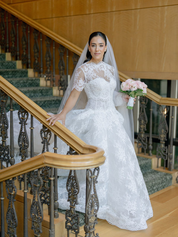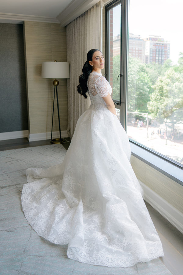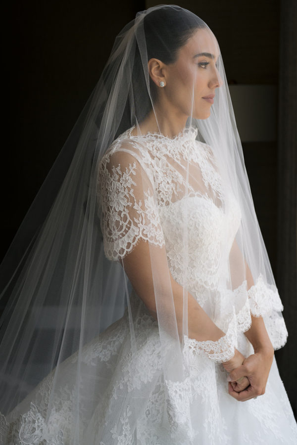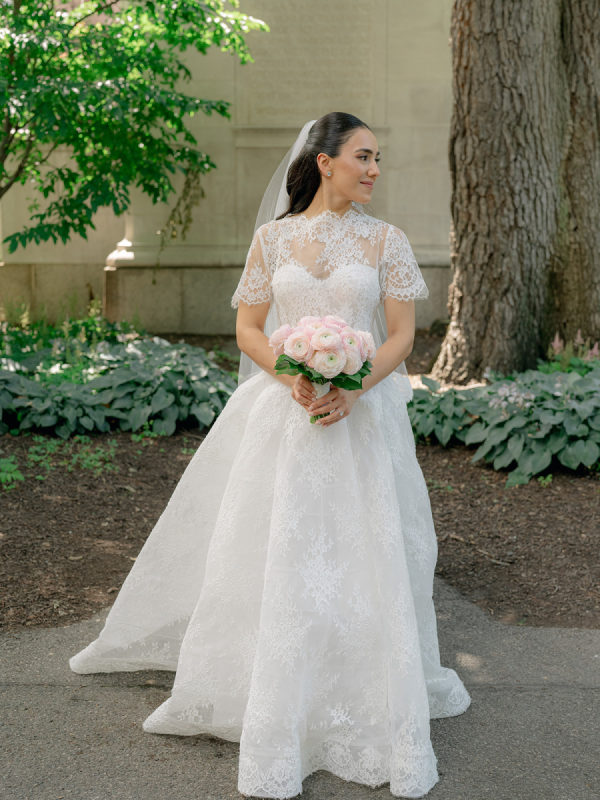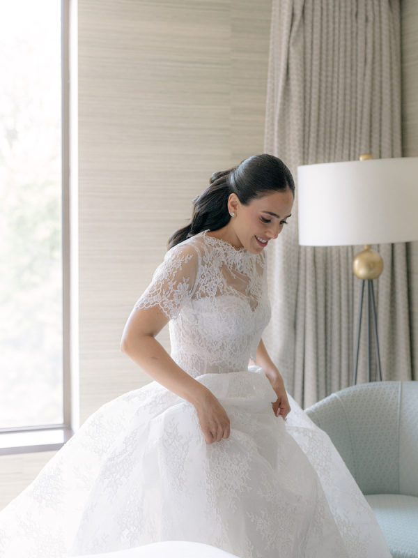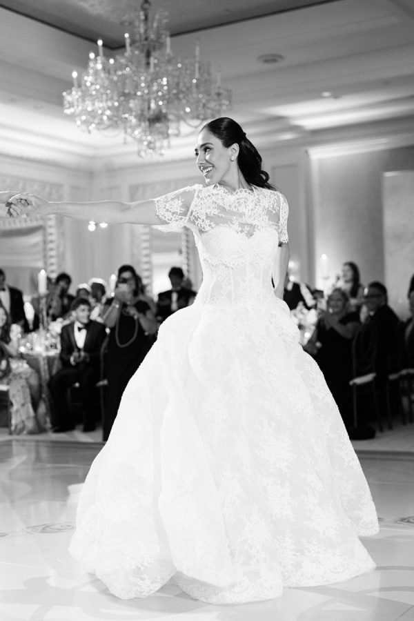 [field title=”Wedding Gown”]The bride wore the Alexandra gown by Monique Lhuillier, a drop-waist lace ballgown with a high-neck lace overlay. The timeless silhouette evoked old-world bridal style with a touch of modern versatility, as the lace topper came off after the first dance for a subtle second look.[/field]