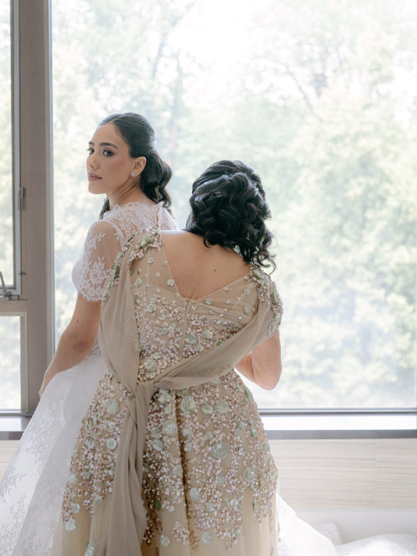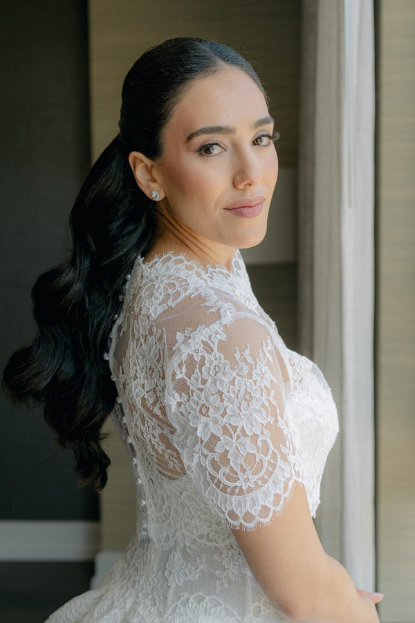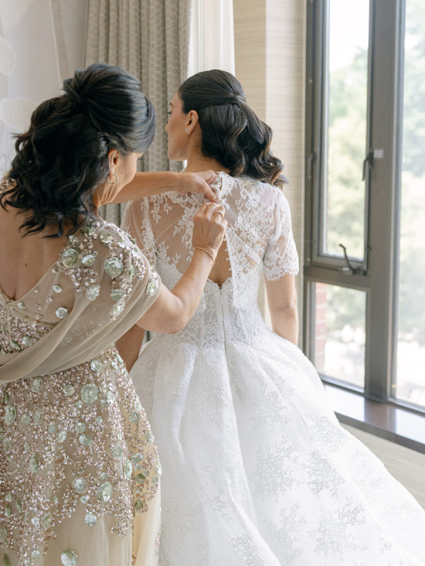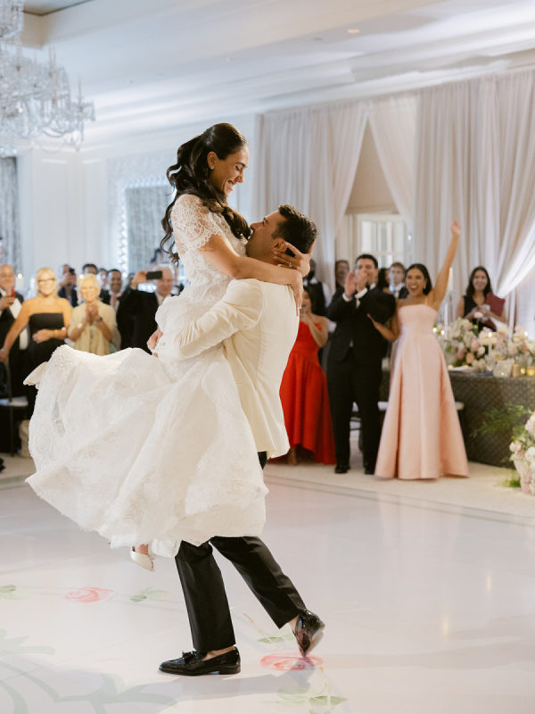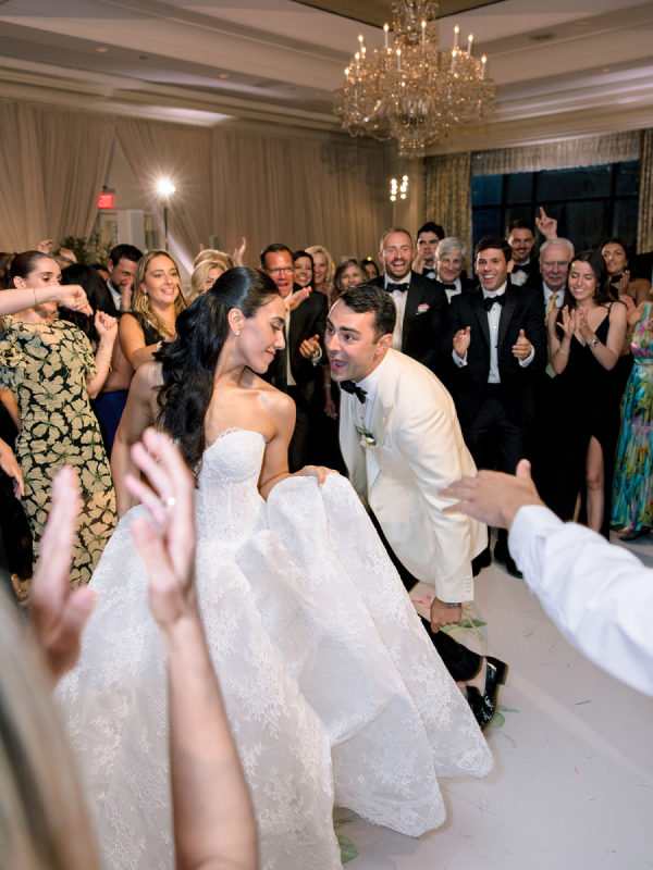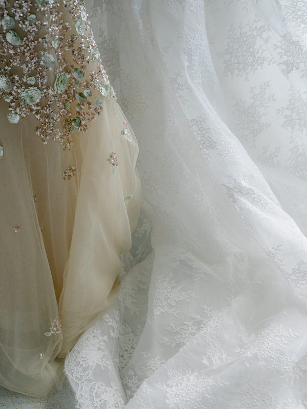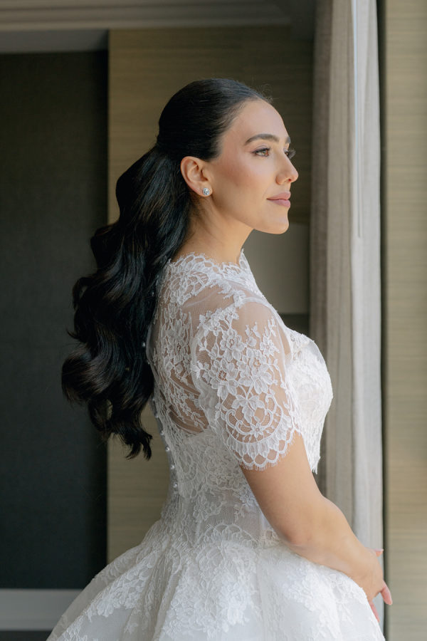 [field title=”Wedding Gown”]The bride wore the Alexandra gown by Monique Lhuillier, a drop-waist lace ballgown with a high-neck lace overlay. The timeless silhouette evoked old-world bridal style with a touch of modern versatility, as the lace topper came off after the first dance for a subtle second look.[/field]