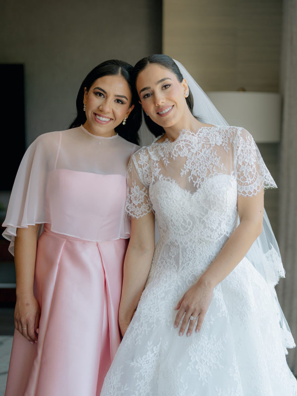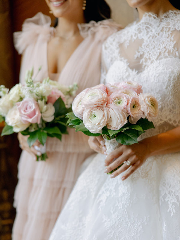 The bride’s sisters and sister-in-law wore gowns in varying shades and styles of blush pink, creating a soft, romantic palette that highlighted their individuality while staying cohesive.