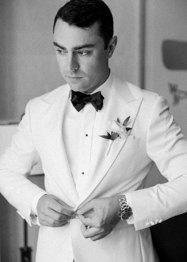 [field title=”Groomsman Attire”]The groom wore a custom tuxedo from Mr. Sid in Newton. The groom’s ivory jacket and black bowtie were classic yet fresh, perfectly complementing the bride’s gown.[/field]