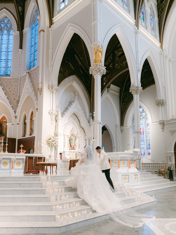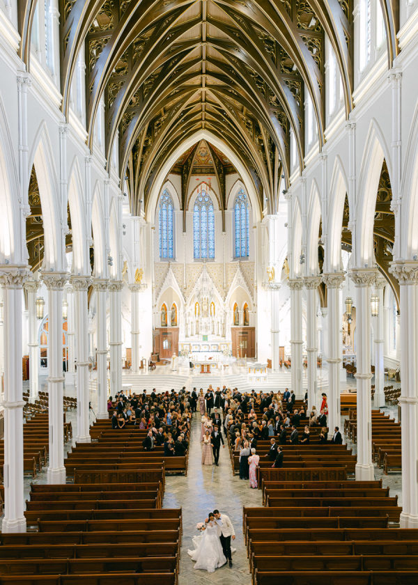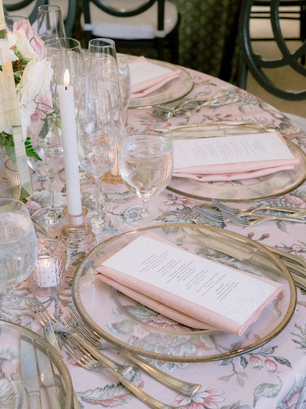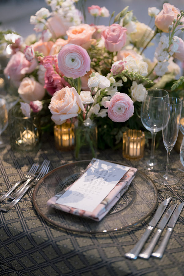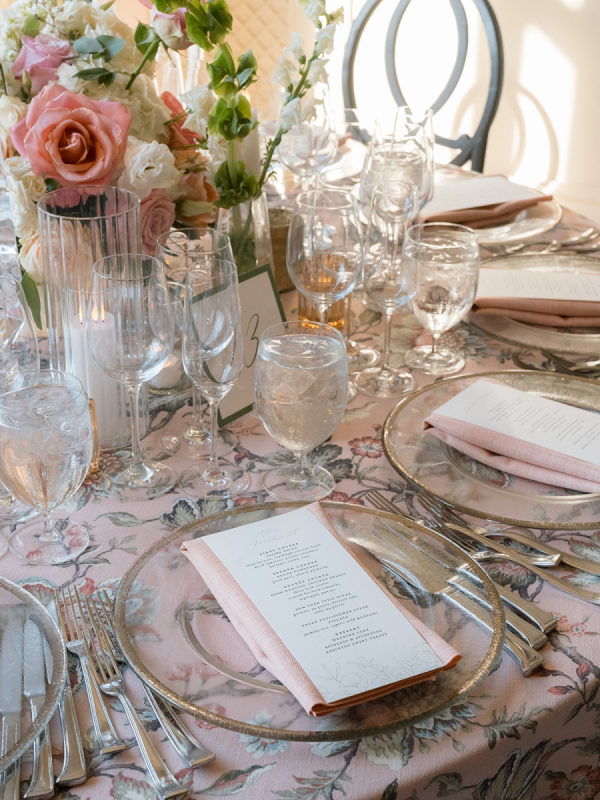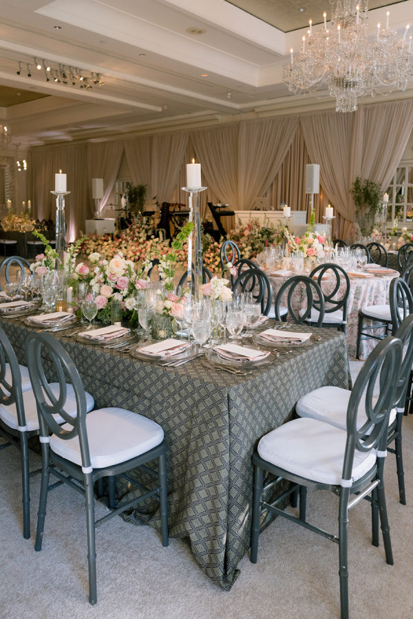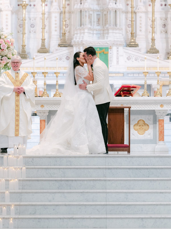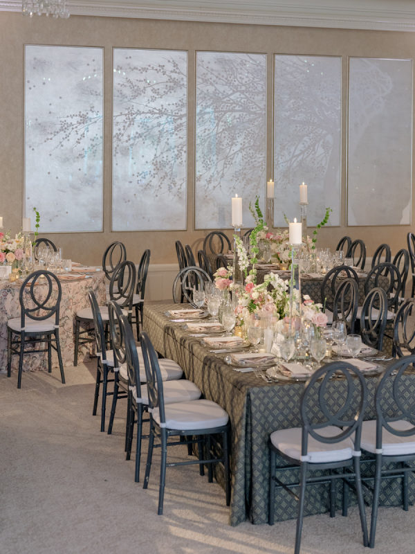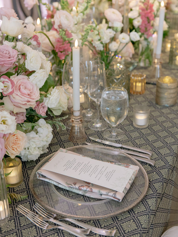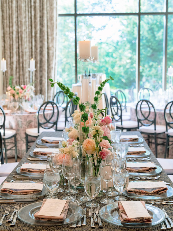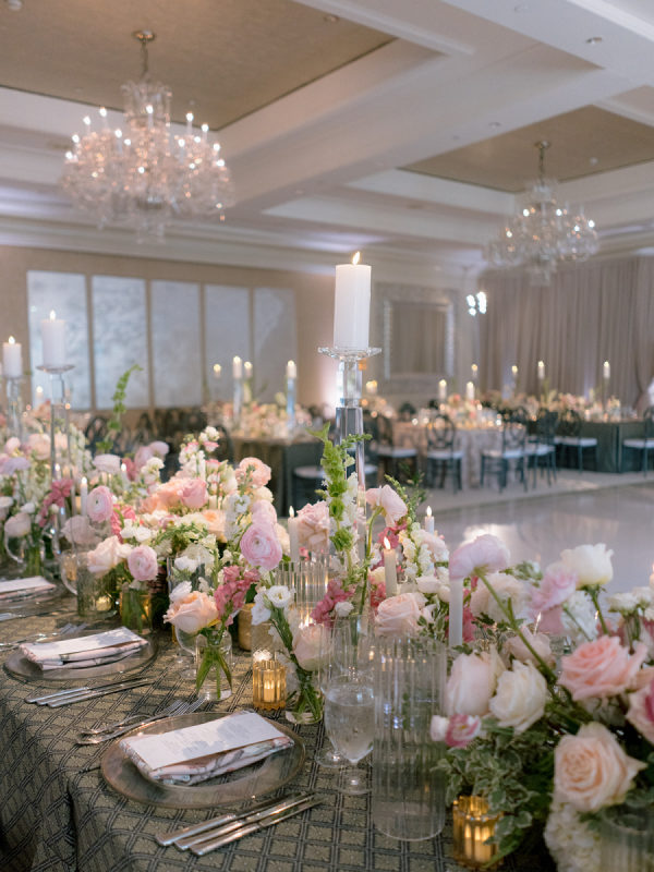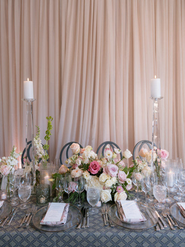 [field title=”Florals & Decor”]Ceremony florals highlighted the grandeur of the historic Boston church with tall blush and ivory arrangements and a sea of candles leading to the altar. At the reception, floral linens, tailored draping, and lush garden-inspired arrangements of roses and greenery created a romantic, candlelit atmosphere. The design balanced softness with edge, blending light blush blooms with darker linens for a layered, timeless look.[/field]