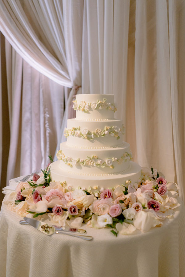 A four-tier white cake adorned with delicate sugar flowers was displayed atop a bed of fresh blooms, echoing the romance of the day.