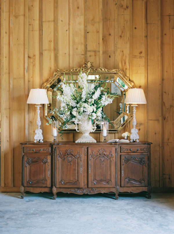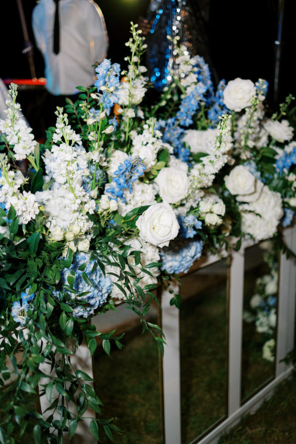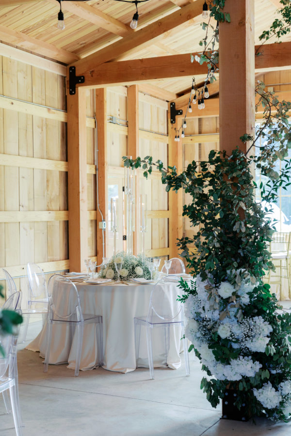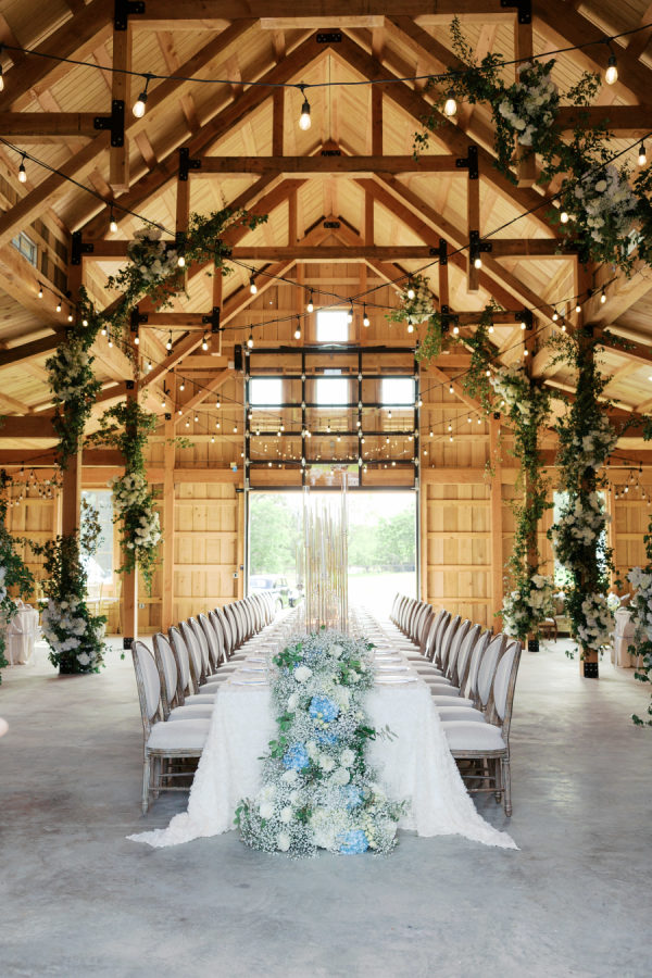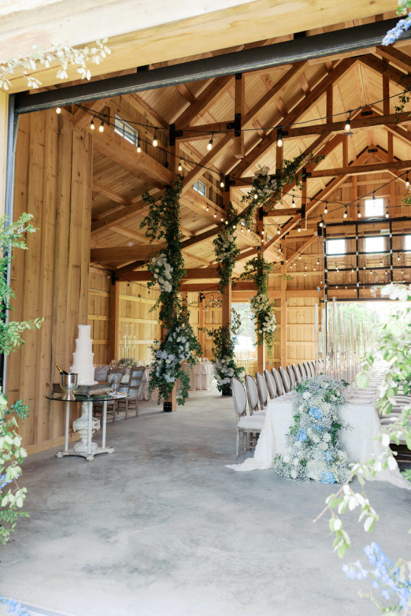 [field title=”Florals & Decor”]Lush white and blue florals adorned the ceremony space and brought connection to the overflowing florals at the reception space, where a floral entrance led guests inside the barn to their seats. Arrangements lined the stage where then band played and trailed up the pillars in the barn.[/field]