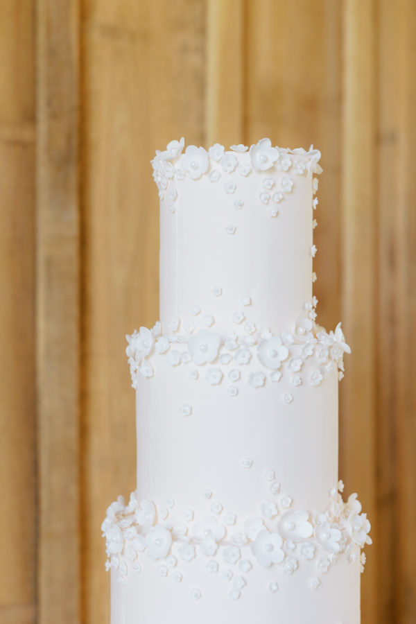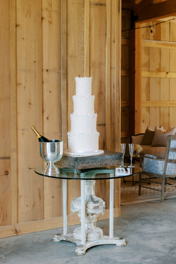 The cake featured small sugar flowers throughout, with a nod to the bride’s dress and was a three tier cake on a glass table in the barn where the reception was held.