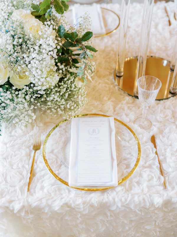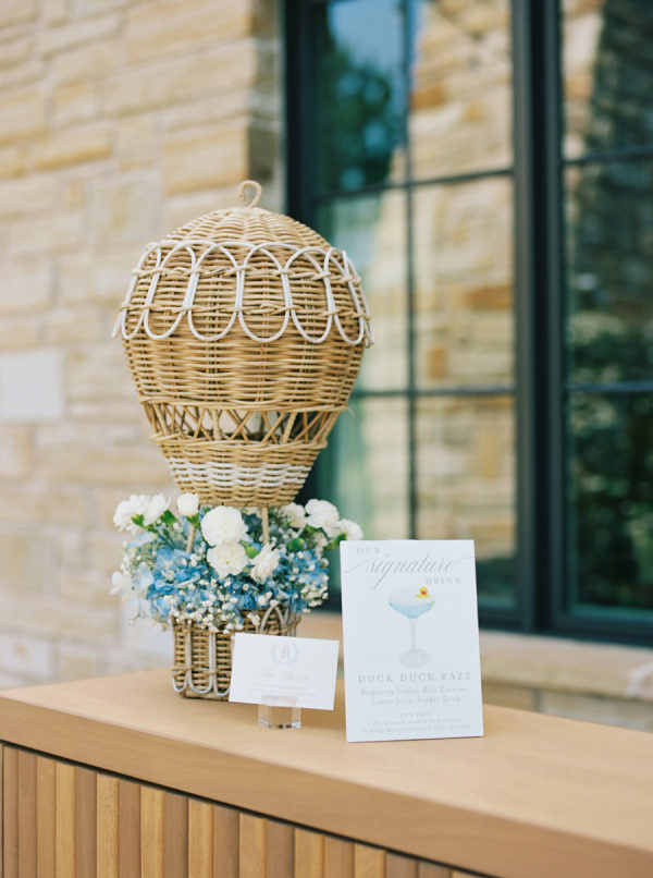 [field title=”Special Detail #1″]The couple share a love of Disney with the groom himself being a former Cast Member at Walt Disney World and added little nods of Disney throughout. The hot air balloon accents and rubber duck cocktails reference their first date at The Boathouse at Disney Springs. The bride had her perfume custom engraved at Disney with their family home on it. They used stamps of Walt Disney for the invitation suite, and the groom added the hidden Mickey to the day with his Mickey cufflinks.[/field]