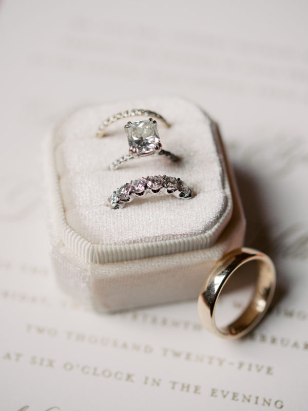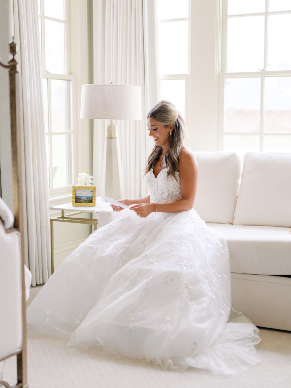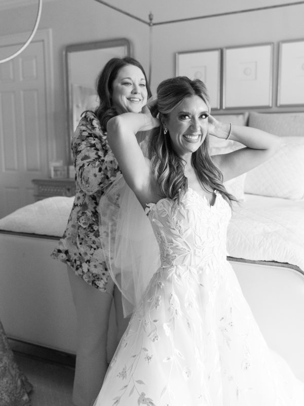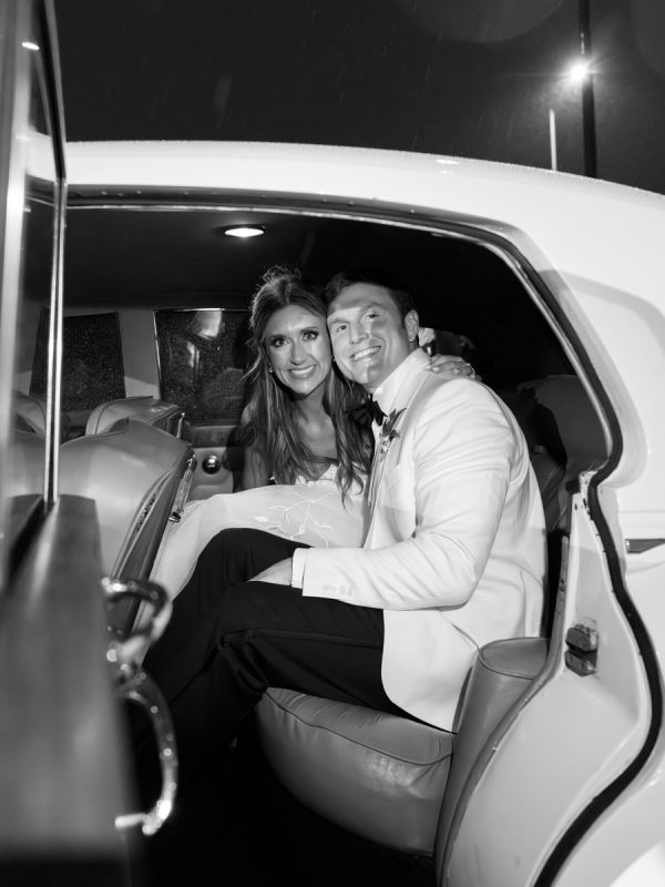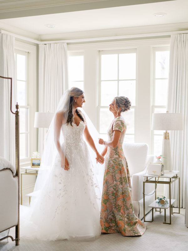 Anna Kathryn’s romantic wedding gown walked the runway of Oscar de la Renta’s iconic 2024 bridal collection. Her dress is made with dreamy floral applique details, touches of glistening Swarovski crystal, and an abundance of layers of Oscar de la Renta’s beautiful tulle – all of what made her gown an unforgettable staple of their wedding night! Earrings are from Jennifer Behr’s beautiful bridal collection. Mother of the Bride’s dress was a custom design by Nardos, earrings were custom-made by Katherine Jetter, and all were styled by Julie Roberts at Elizabeth Anthony.