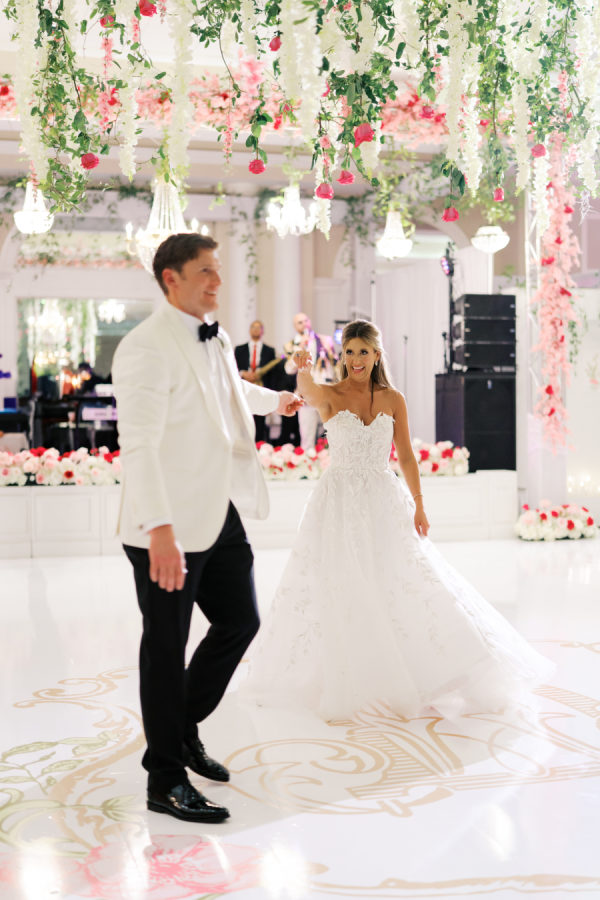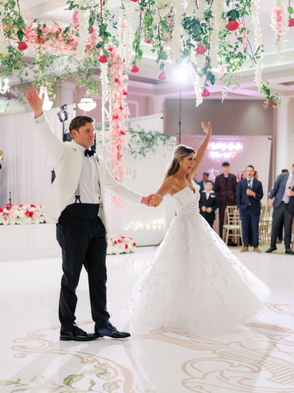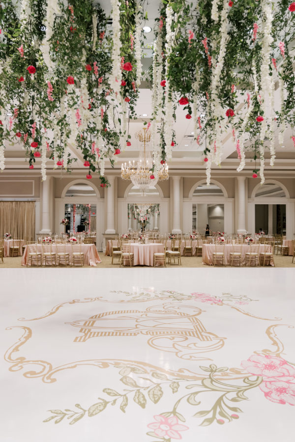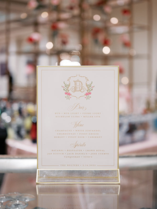 Hark Creative Owner and Designer, Caitlin Gossen, created the monogram and a colorful pattern for the Save the Dates that Wedding Planner, Hannah Traha, weaved throughout the event. Hannah had a custom backdrop created for the Valentini Espresso Martini Station, and the skirt in the women’s bathroom was made with the pattern. The Monogram Caitlin created was the setting for the dance floor, which was under hanging florals, greenery, and roses.