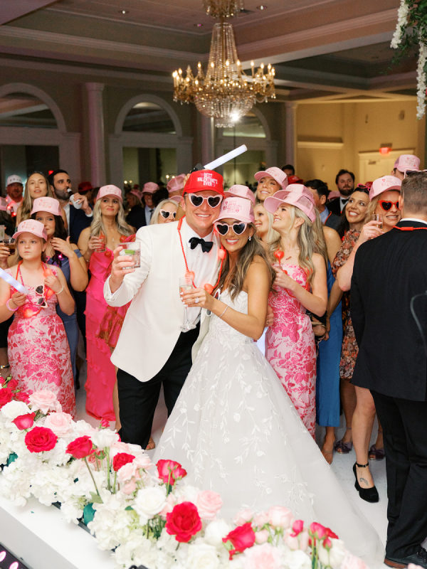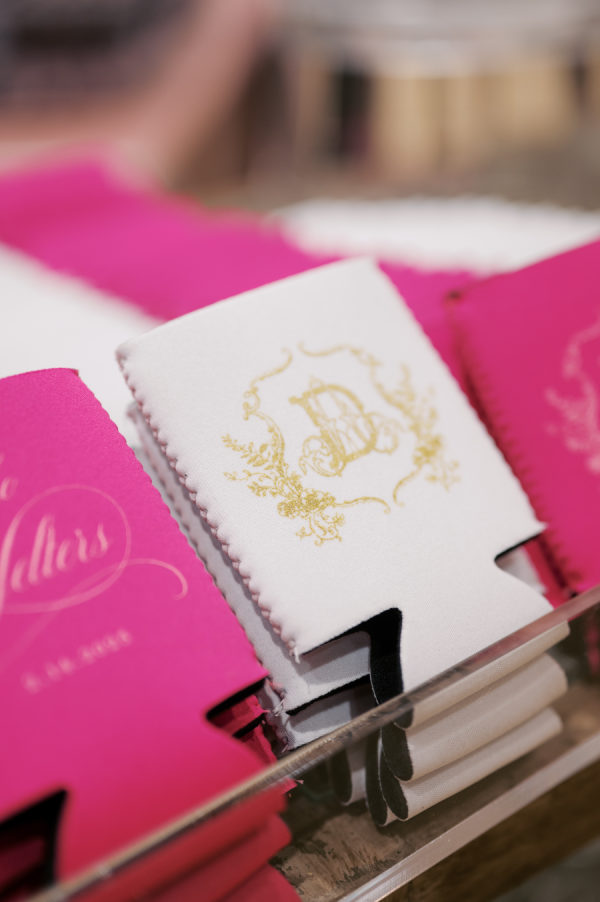The groom’s cake was a replica of Tiger Stadium, a nod to his time playing football for the LSU Tigers. It was complete with a photo of the DJ on the scoreboard and replicas of the bride and groom on the outside of the station. LSU and Ole Miss (the bride’s alma mater) Drink Stirrers were set at the bar so the guests could choose their team.