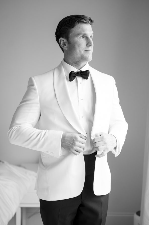 The groom wore a sophisticated, custom tuxedo by Jack Victor, styled by the wonderful team at Vincent Ford Custom Apparel in Houston, Texas. His white dinner jacket was the perfect complement to Anna Kathryn’s wedding dress! DJ’s groomsmen’s tuxedos were tuxedos from Mary Ellen’s Tux Shop in Lafayette, Louisiana.