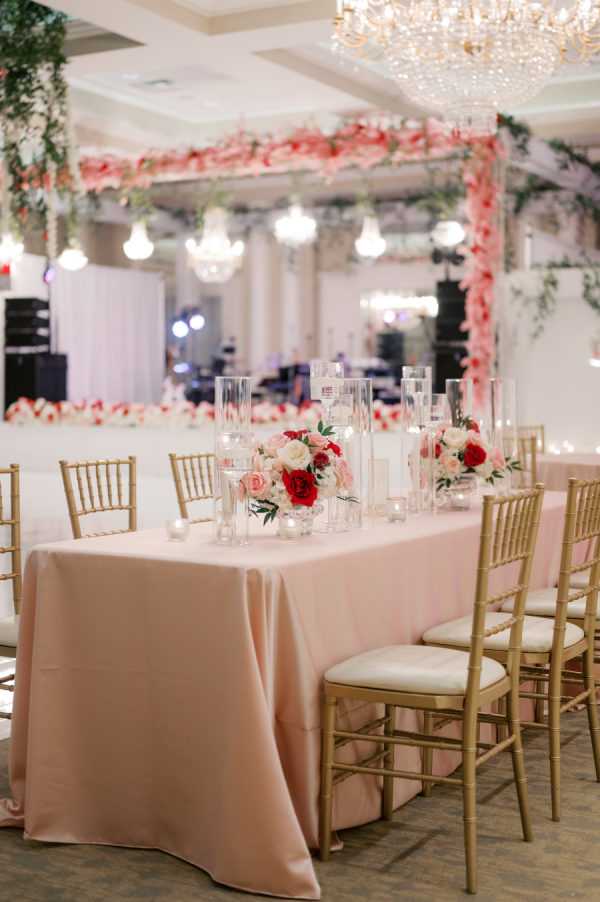 Blush Peonies, Ranunculus, Garden Roses, and Orchids in shades of pink enhanced every part of the reception. Blush Satin Linens draped each table, where candles and florals were added throughout. Cherry Blossoms and Roses covered the structure that held hanging vintage chandeliers over the band performance area. Shadow Boxes with Acrylic wedding monogram created by Aaron Grey Co. A Lounge Area was set behind the dance floor in white, blush, and hot pink, accented with monogrammed pillows.