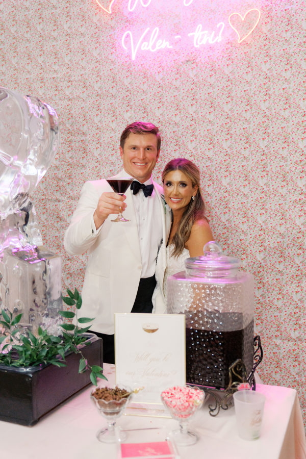 We designed a menu that featured many local favorites, such as Crab Claws and Shrimp Marmalade set inside Martini Glasses and presented on an ice display. Guests enjoyed Beef Tenderloin hand-carved throughout the night. The couple’s favorite, margaritas from Superior Grill Lafayette, were picked up and enjoyed by the wedding party before the Trolley ride to the reception. A pink neon sign reading “Will you be our Valen-tini” featured an Ice Luge serving the bride’s favorite, an Espresso Martini, complete with whole coffee beans and other garnishments.