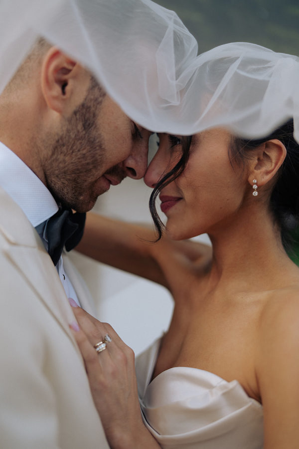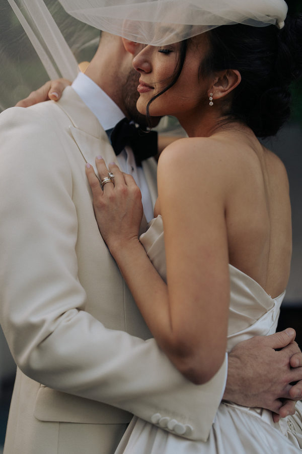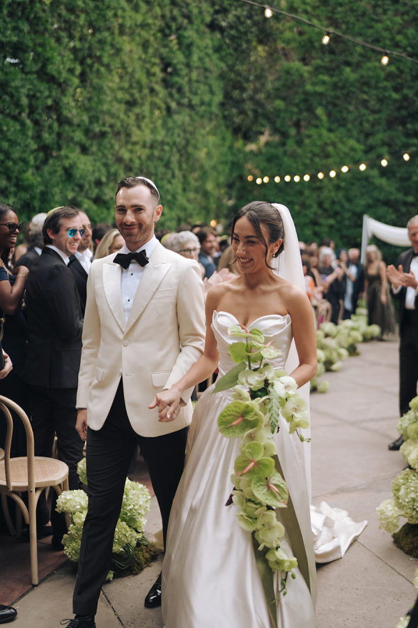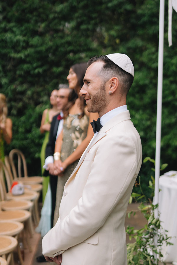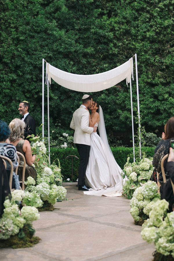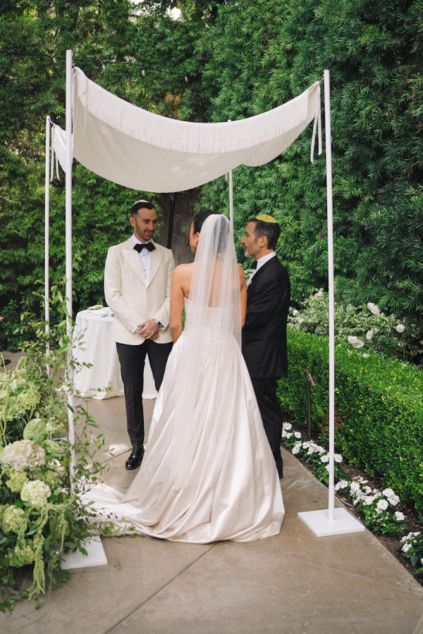 A modern white fringe chuppah framed the couple for their Jewish wedding ceremony.