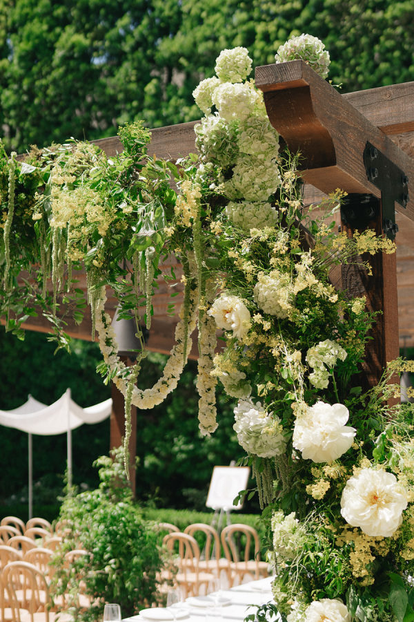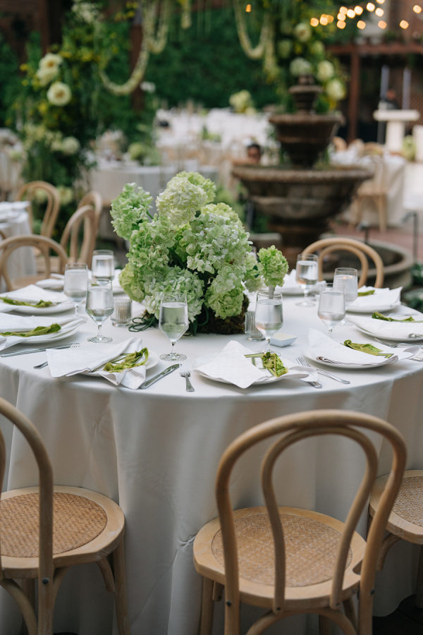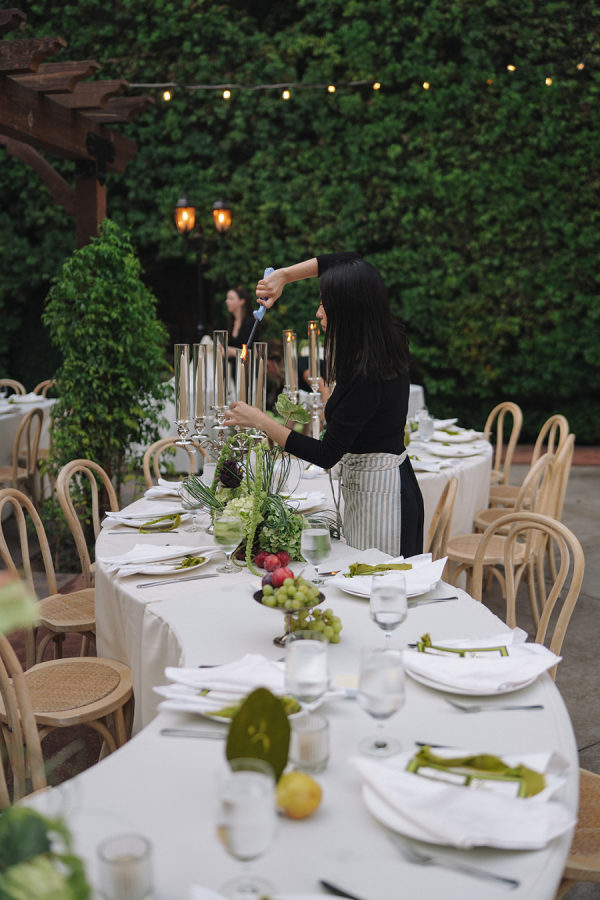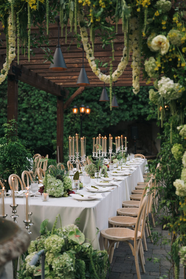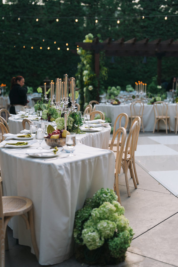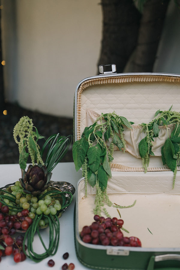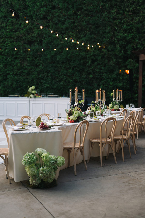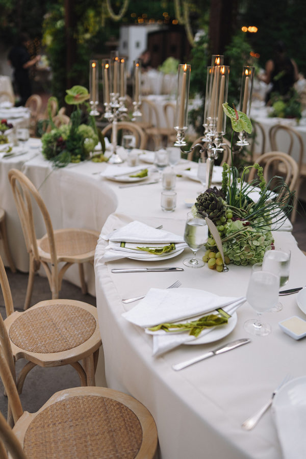 [field title=”Florals & Decor”]Modern, whimsical sculptural florals were mixed with green beans, grapes, and artichokes to create a whimsical element. Large vintage silver candelabras and trays mixed into the table decor balanced modern elements such as serpentine tables. [/field]