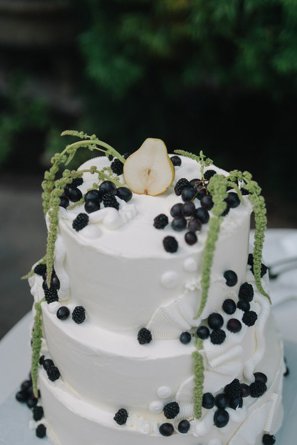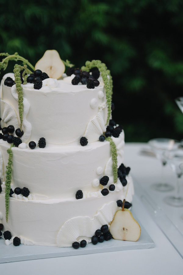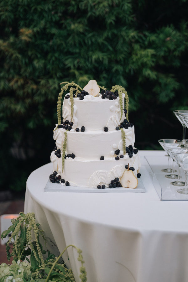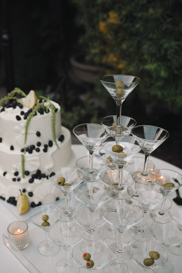 A large three-tier wedding cake was adorned with amaranth and grapes, set next to a dirty martini tower.