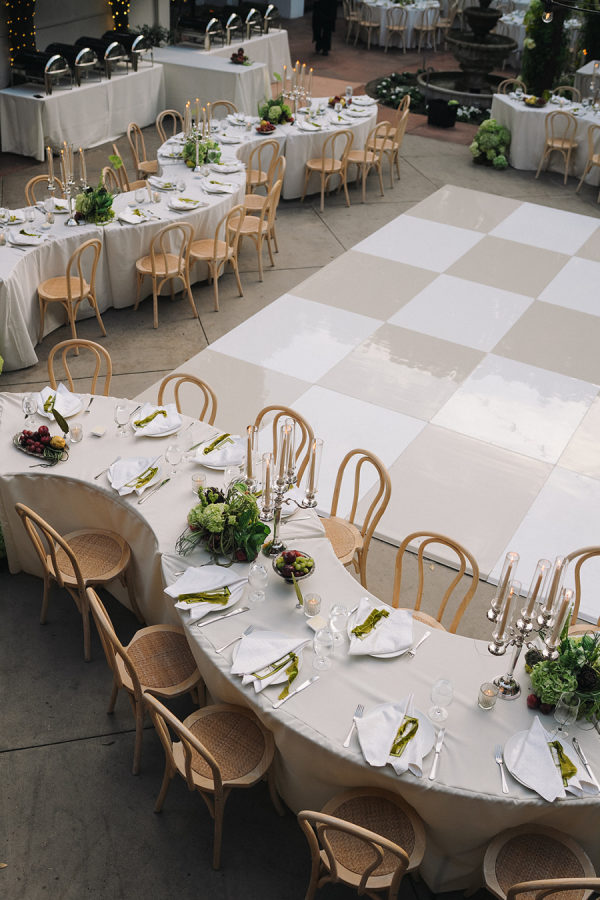 Serpentine tables framed the cream and white checkered dance floor.
