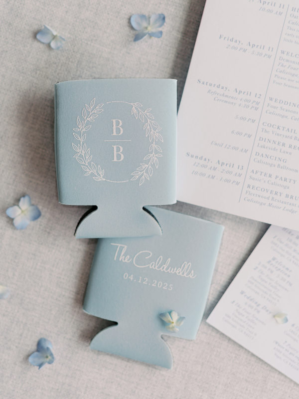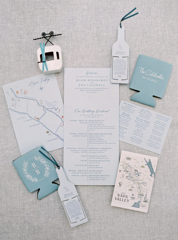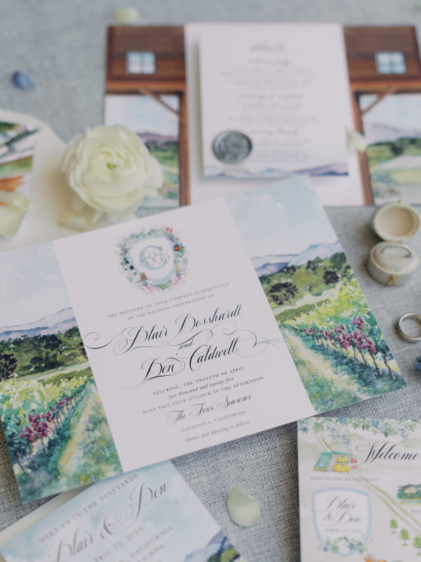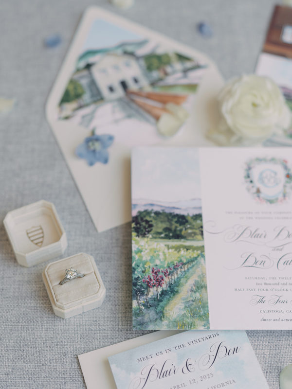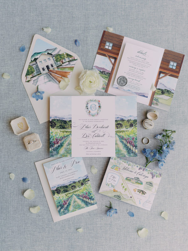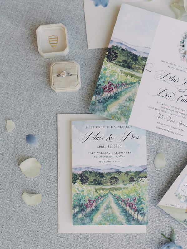 The beautiful watercolor invitation suite was custom designed and featured watercolors of the Napa scenery, the venue and a map of the various weekend locations.