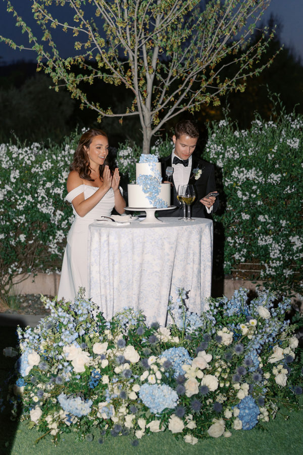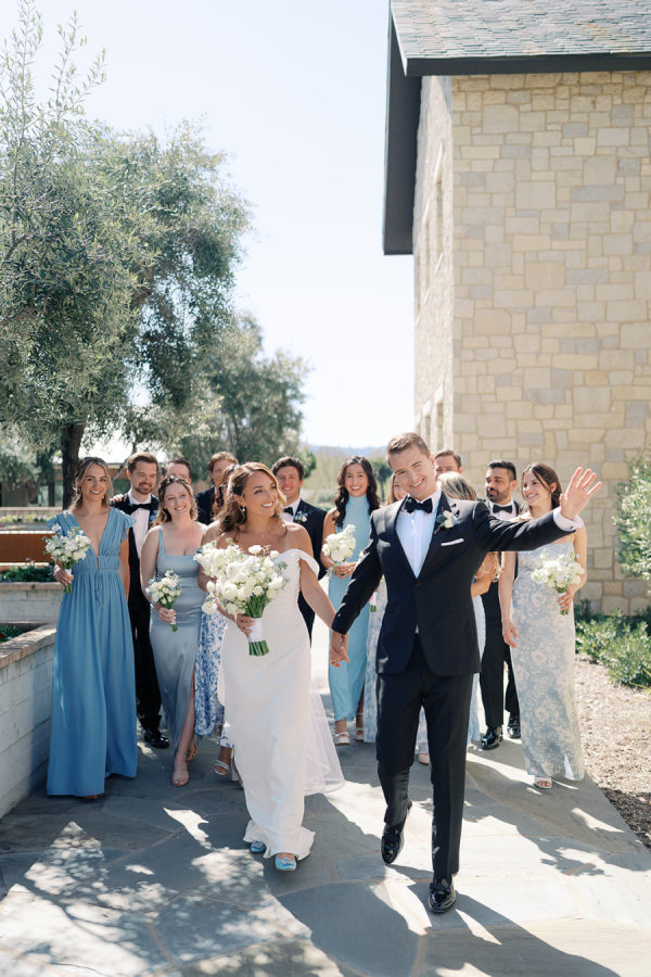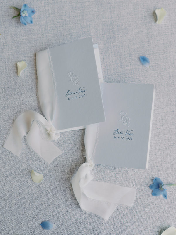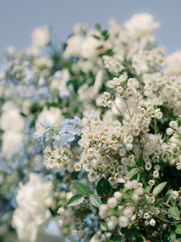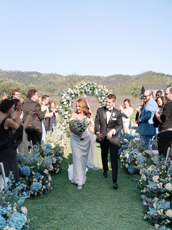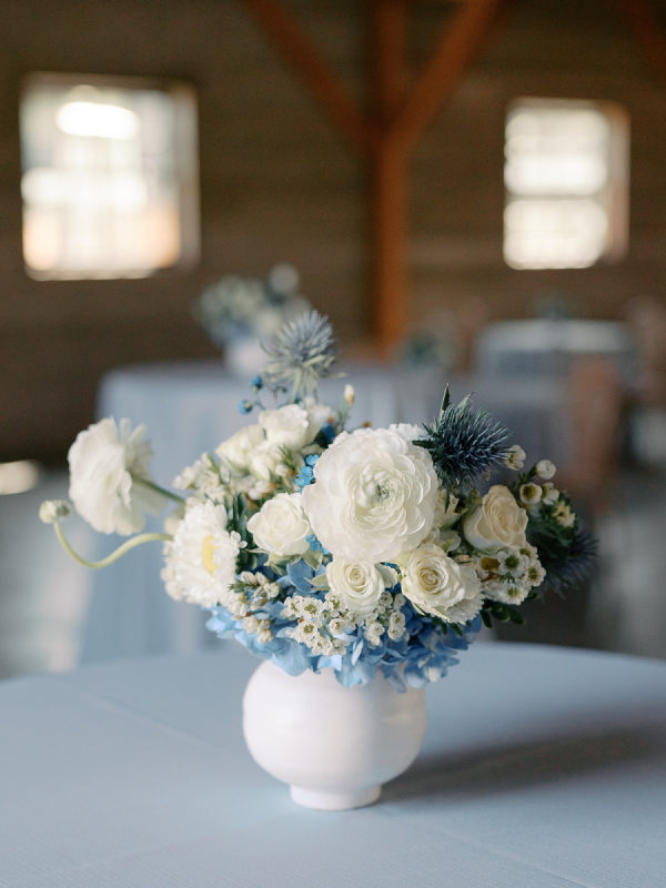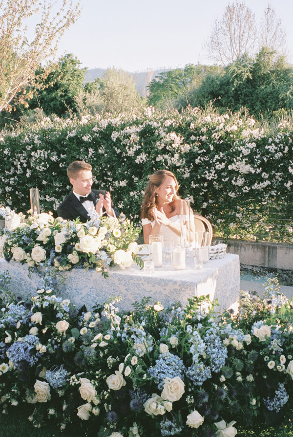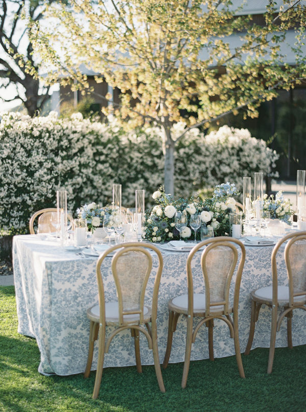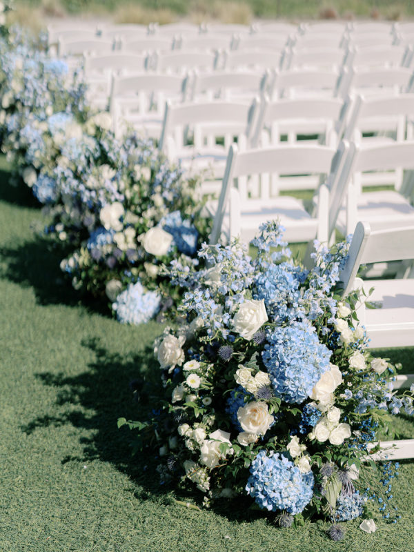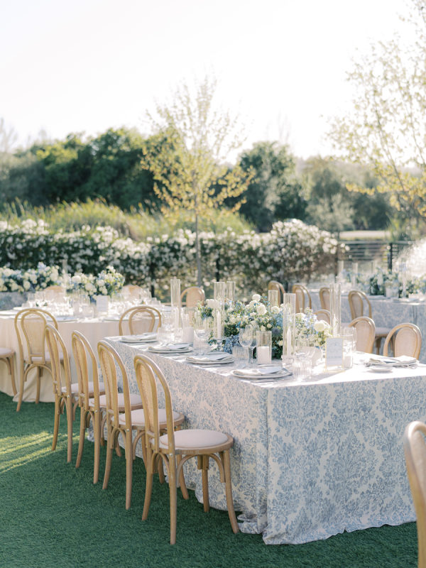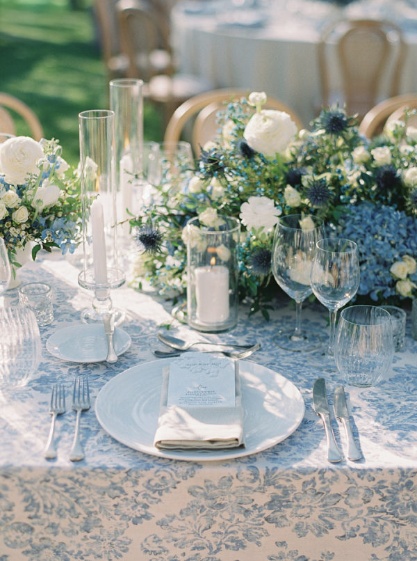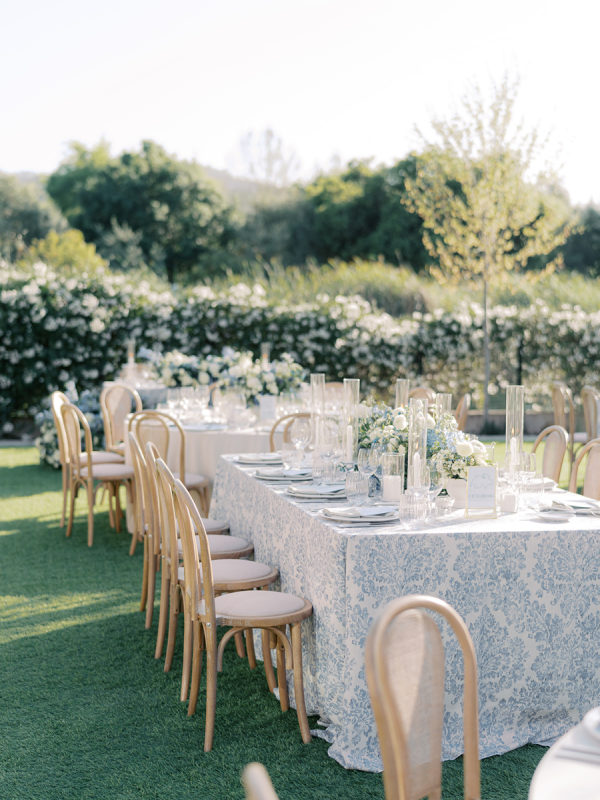 Soft, delicate blues and cream, with sage green accents were chosen as complementary colors to the venue’s luxurious and neutral facade and picturesque views of the Napa Valley. The couple desired a warm, welcoming atmosphere with a touch of elegance and luxury — they were married at the Four Seasons, after all!