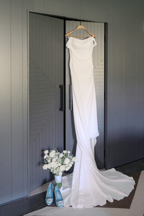[field title=”Wedding Gown”]Blair chose an elegant silk dress designed by Martina Liana, from a bridal boutique in Washington, DC. The elegant draped neckline with pearls and cinched bodice fit her perfectly! She accessorized with her Something Blue heels from Manolo Blahnik.[/field]