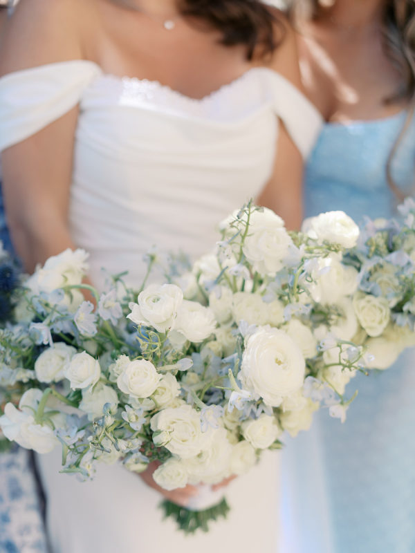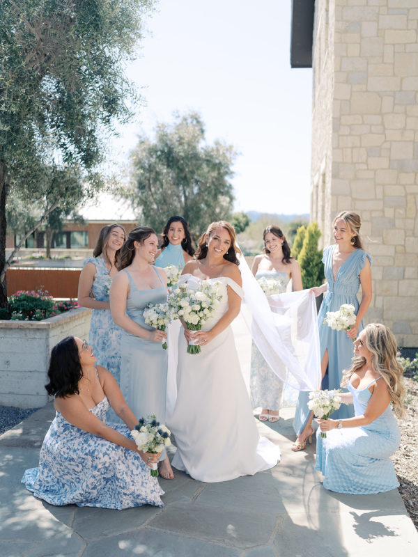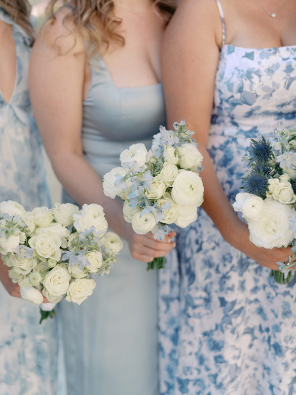 Blair’s ladies each chose their own blue dress — she wanted them to feel beautiful and comfortable on her wedding day! A mixture of solid and floral prints and shades ranging from sky blue to dusty blue harmonized together.