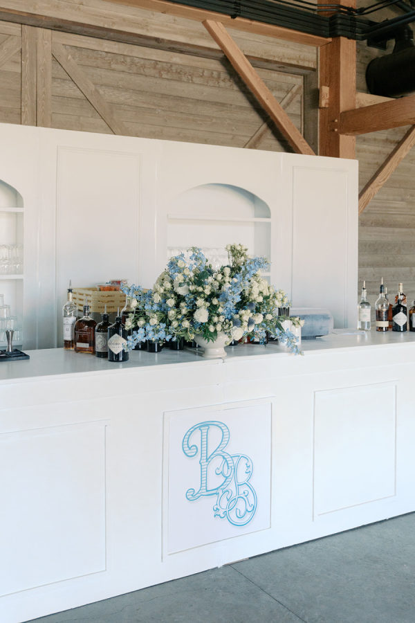 [field title=”Florals & Decor”]Lush blue and white florals were prominent throughout the special day. From the aisle florals lining the ceremony walk way and the stunning arch serving as a lovely focal point for the couple during their ceremony. A custom bar with their monogram was created for the cocktail hour. The al fresco reception featured beautiful blue print linens and delectable florals lining the tables. One of the most fun and personal touches included the custom gondola seating wall, as a nod to the couple’s love story and proposal! Guests loved it![/field]