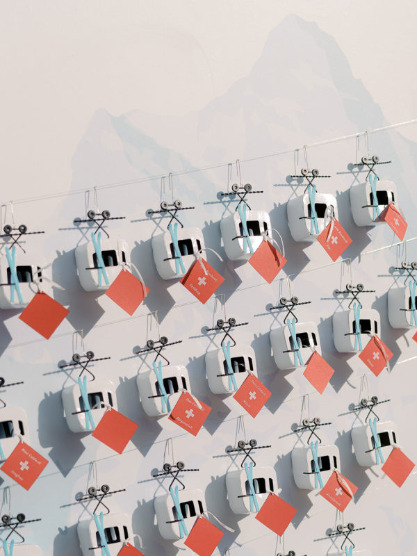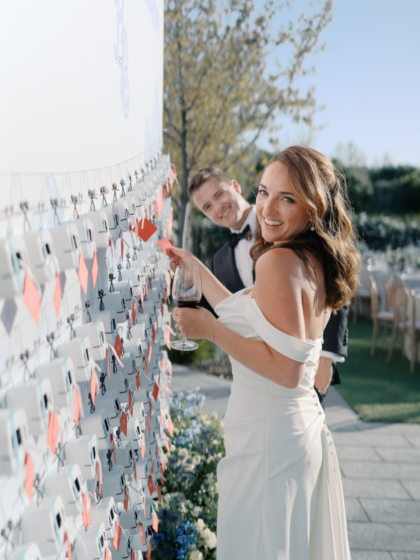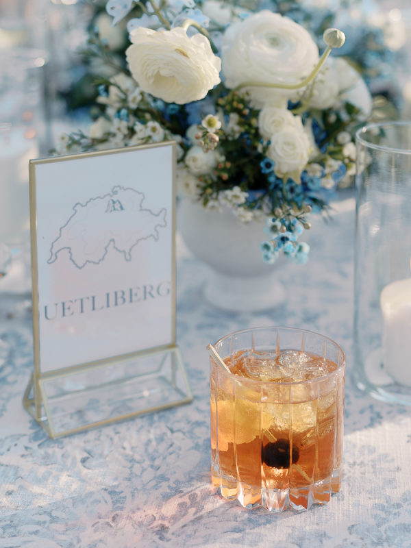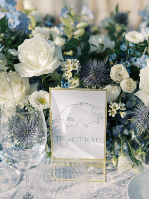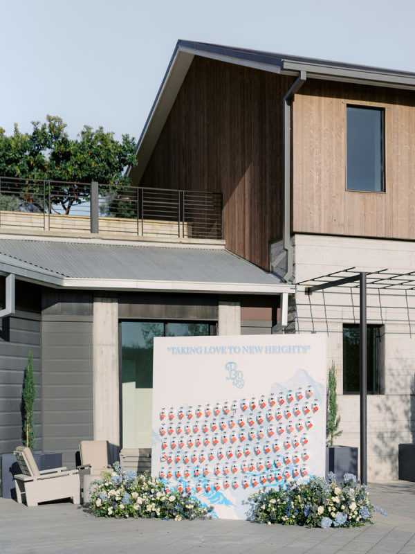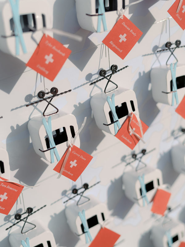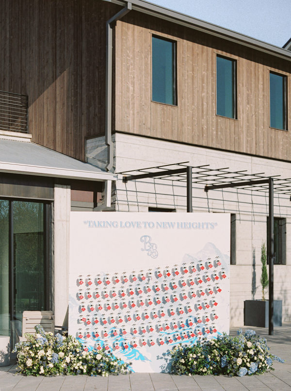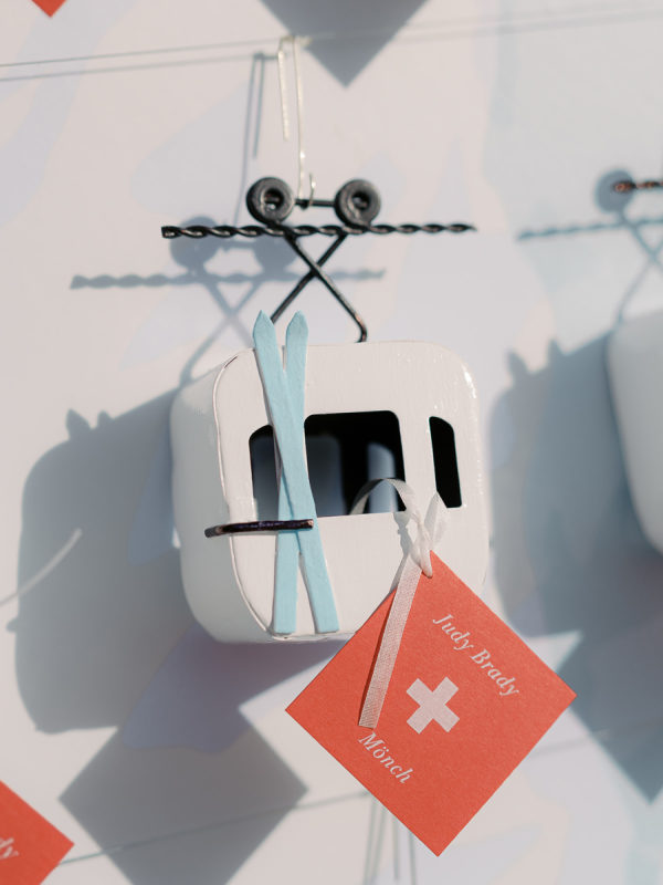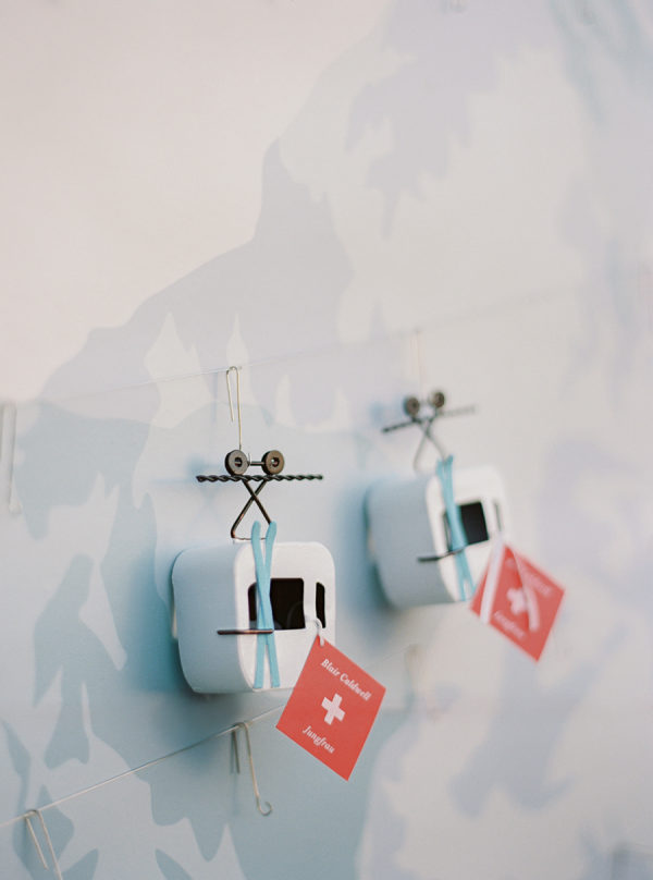 The gondola seating wall was a nod to their engagement, where they skied in Lake Tahoe. It read “Taking Love to New Heights” and tables were favorite skiing mountains, including Jungfrau in Switzerland for the newlyweds’ table.