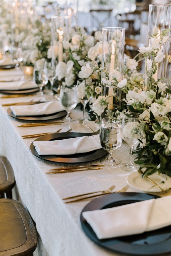 [field title=”Special Detail #3″]For the table design, we decided to create 2 distinct table looks between the estate table and the head table. We kept the estate very clean and modern with white linen, black chargers, black candle and vase elements, and gold flatware.