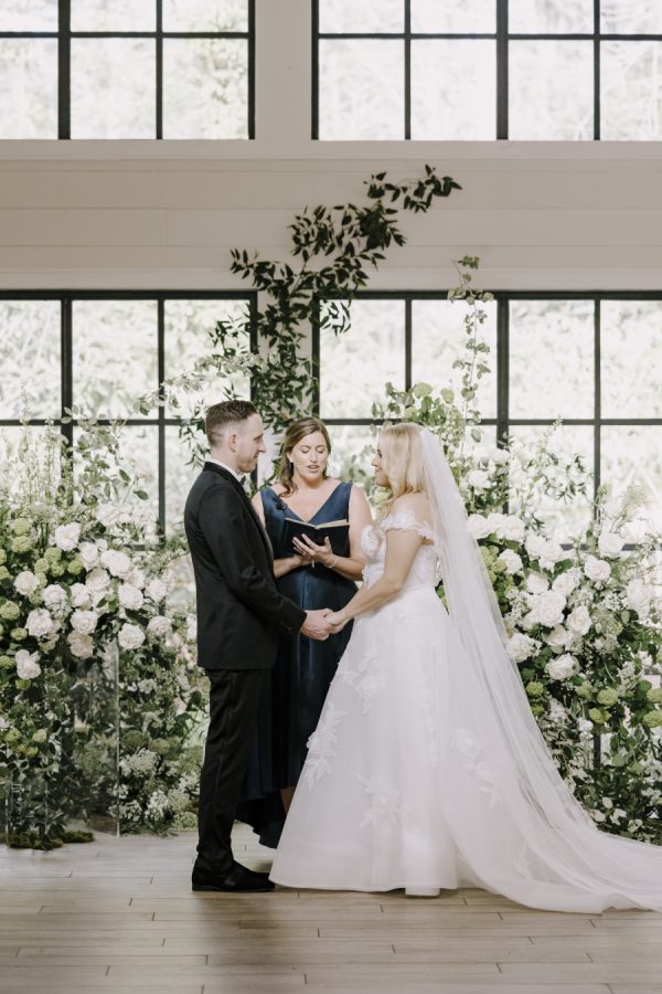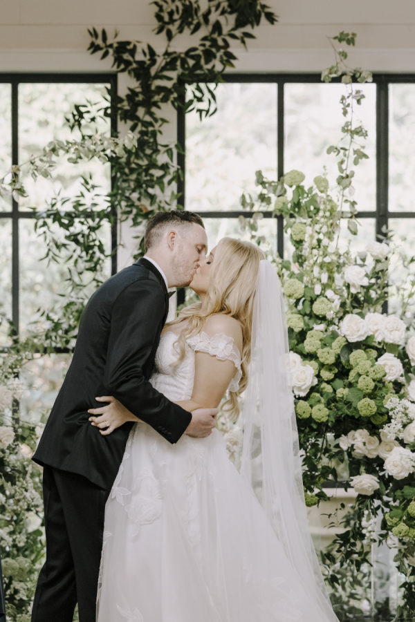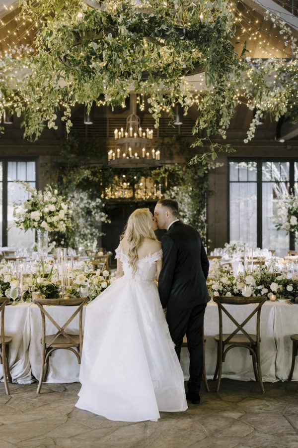 The wedding colors consisted of neutrals and natural greenery to play into the natural beauty of the venue, plus keep the overall style elegant and sophisticated. Her colors were ivory, champagne, and green with touches of black.