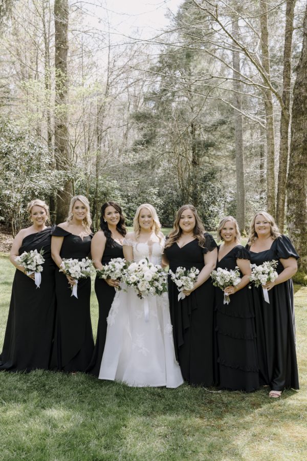 Bridesmaids’ dresses are from everywhere! The girls got to select their own as long as it was floor-length and black. This allowed each girl to select something they felt comfortable in and wear it again in the future.