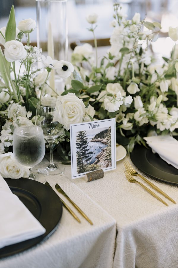 The seating chart display (also provided by Party Bound) had a subtle mountain design on the backdrop and each table card featured a watercolor digital painting of a special place the couple traveled to during their relationship.
