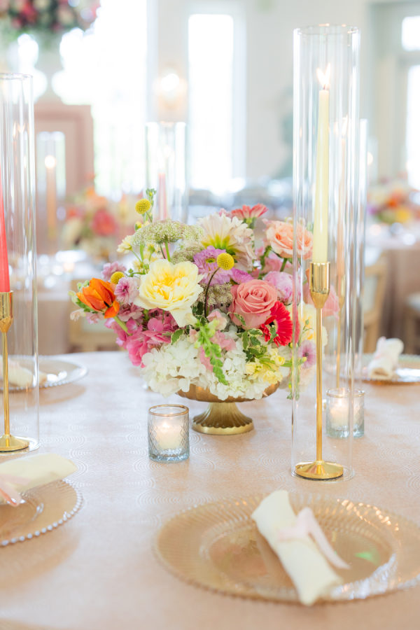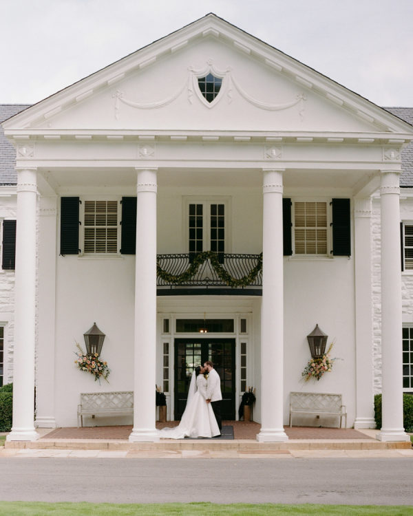 When choosing the design for the reception, Symone wanted to highlight her favorite color palettes that she has used throughout her nearly 10 years in the industry as a wedding and event designer. She aimed to select designs that have stood the test of time and would always be classically beautiful and true to her personal style. Due to the size of the Mountain Brook Club, she chose three different palettes to create separate experiences for guests within each room. Upon arrival, guests were greeted by full floral archways that reflected the color scheme of their respective rooms. The Bridgerton-inspired color palette that came to life in the living room and terrace focused on light blues, blushes, yellows, and an overall woodland garden style. Linens with as much texture as the florals are always a must, so she paired a two-tone green linen with rattan sofas and a neutral wooden chair to ensure guests felt all the comforts of al fresco dining throughout this southern summer evening. For the dining room, Symone selected a feminine dream palette of pinks, oranges, and peaches. She has always had a very “girly” side, so this was a no-brainer! The abundance of natural light highlighted the classic attributes of this 1929 Colonial Revival, including the iconic dancing guest murals that share the same hues. Lastly, Symone couldn’t have a true Southern wedding without incorporating all-white florals in the ballroom. Traditionally, all-white wedding florals symbolize new beginnings, making the ballroom—the epicenter of the celebration—the perfect setting for this color scheme. She focused on emphasizing the room’s 1800s-inspired elegance with cascading installations and ornate focal arrangements.