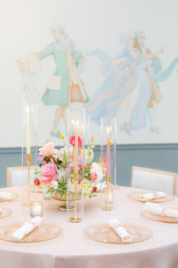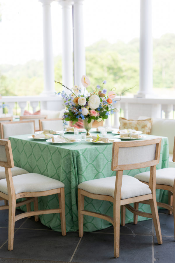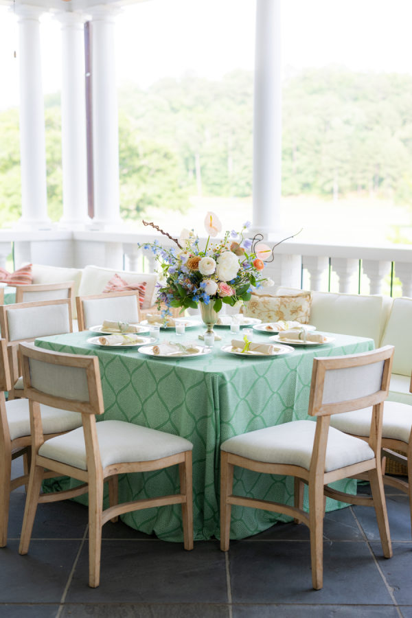 When choosing the design for the reception, I wanted to highlight my favorite color palettes that I have used throughout my nearly 10 years in the industry as a wedding and event designer. I aimed to select designs that have stood the test of time and would always be classically beautiful and true to my personal style. Due to the size of the Mountain Brook Club, I chose three different palettes to create separate experiences for guests within each room. Upon arrival, guests were greeted by full floral archways that reflected the color scheme of their respective rooms. The Bridgerton-inspired color palette that came to life in the living room and terrace focused on light blues, blushes, yellows, and an overall woodland garden style. Linens with as much texture as the florals are always a must, so I paired a two-tone green linen with rattan sofas and a neutral wooden chair to ensure guests felt all the comforts of al fresco dining throughout this southern summer evening. For the dining room, I selected a feminine dream palette of pinks, oranges, and peaches. I have always had a very “girly” side, so this was an instant yes! The abundance of natural light highlighted the classic attributes of this 1929 Colonial Revival, including the iconic dancing guest murals that share the same hues. Lastly, I couldn’t have a true Southern wedding without incorporating all-white florals in the ballroom. Traditionally, all-white wedding florals symbolize new beginnings, making the ballroom—the epicenter of the celebration—the perfect setting for this color scheme. I focused on emphasizing the room’s 1800s-inspired elegance with cascading installations and ornate focal arrangements.