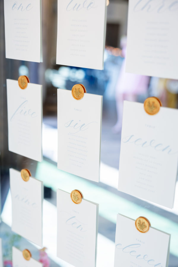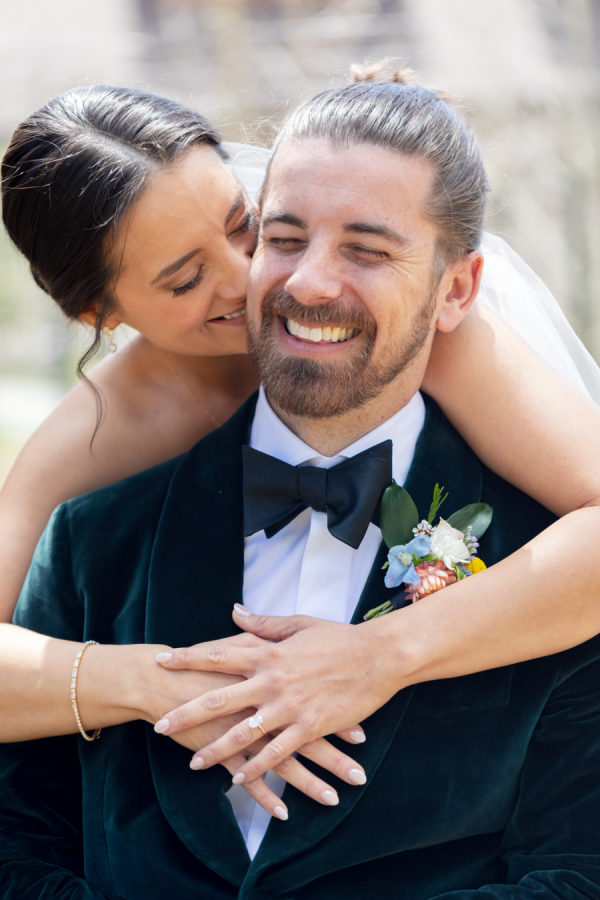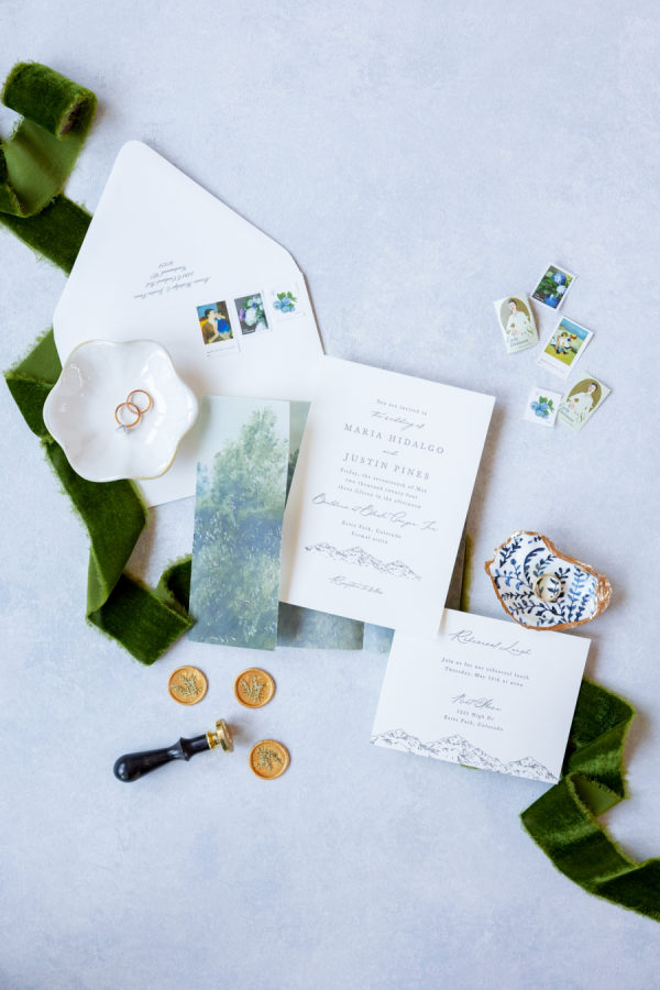 [field title=”Wedding Colors”]We drew inspiration from the mountains and spring wildflowers. Our wedding invitations had dark hues of forrest green to compliment the location of our venue and we had soft blues for the table decor. For attire, Justin wore a dark green velvet dinner jacket to stand out from his groomsmen in black, while the bridesmaids followed a mauve color palette. [/field]