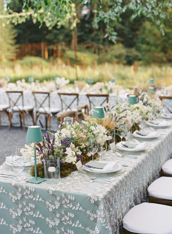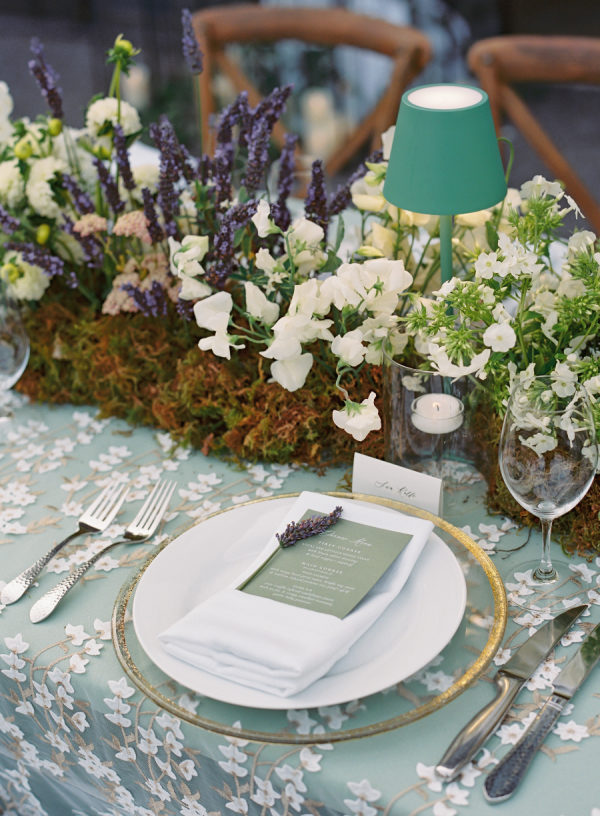 [field title=”Special Detail #3″]The head table featured a custom-cut lace floral overlay that Ginny & Adam were able to keep and can use on their dining table for years to come. The floral on this table “grew” up from a moss table runner, still with lamps popping up in between the lush blooms. The overall effect was whimsical and romantic, with a playful and lighthearted vibe. [/field]