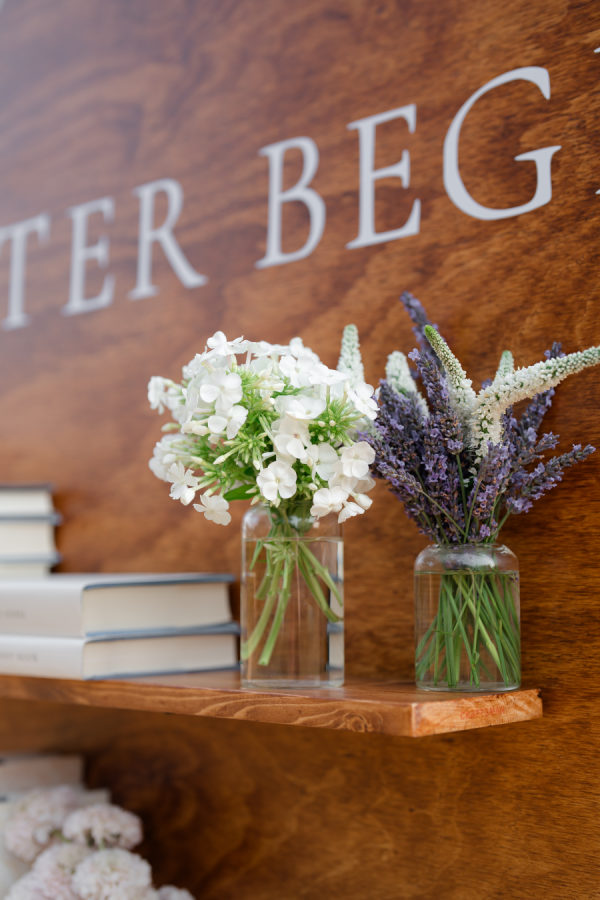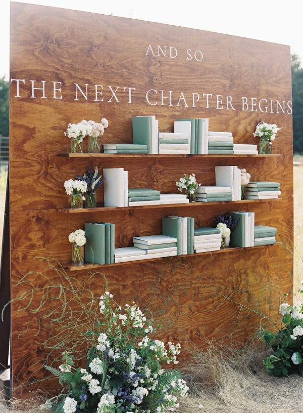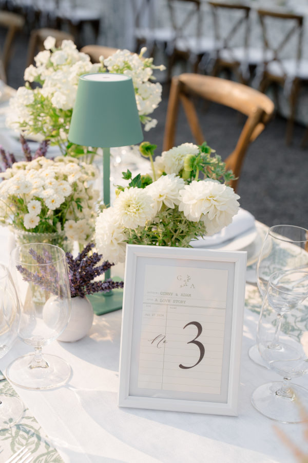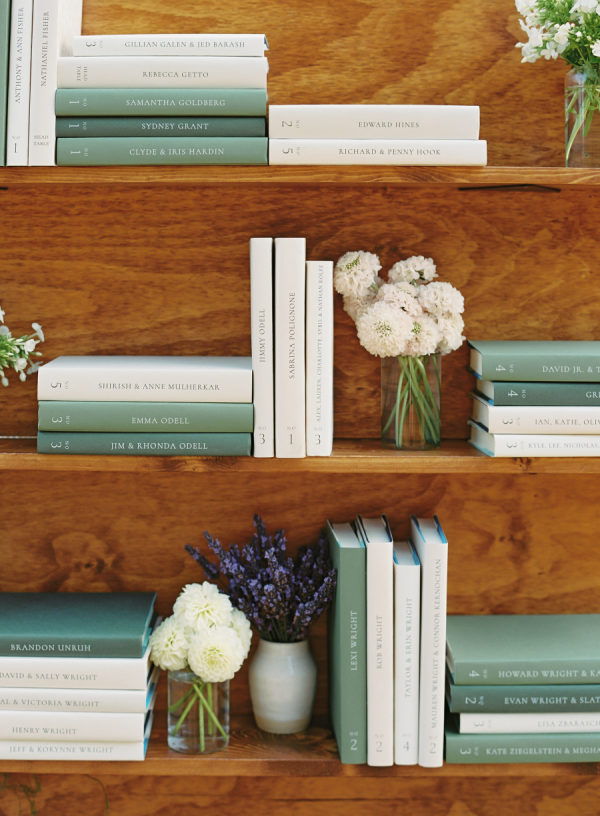 As they are avid readers, we channeled this detail into our seating chart plans by having an elaborate book display with custom book jackets that listed each couple’s seating assignments on the spine. The book jackets were decorated in the same design as the patterned linens at the reception for a cohesive and intentional look. We implemented used books for the display to minimize environmental impacts by repurposing already-made items. Then, we framed customized borrowing cards to act as their table numbers as a way to further tie in their love of literacy and the library element from their seating chart.