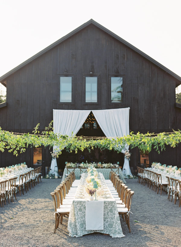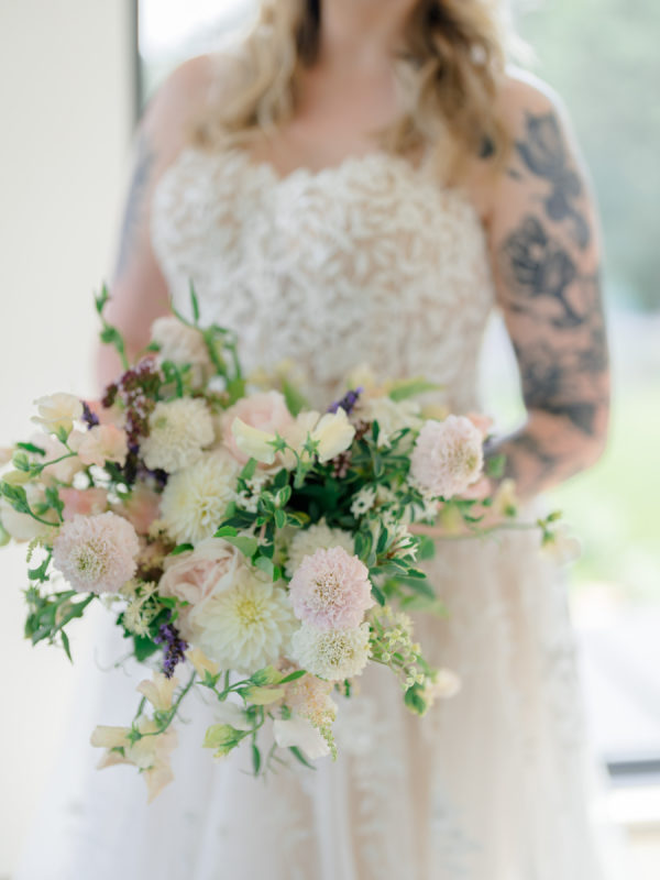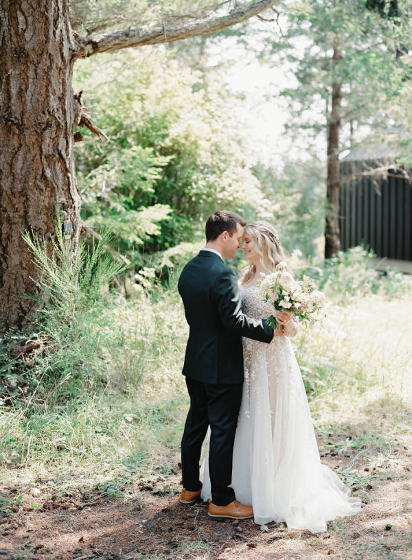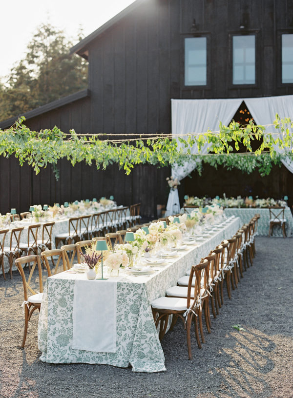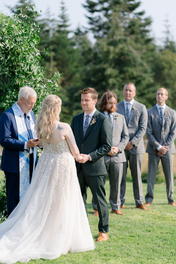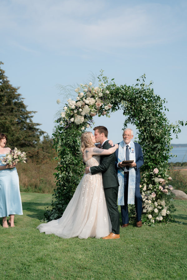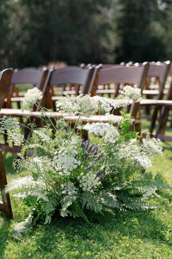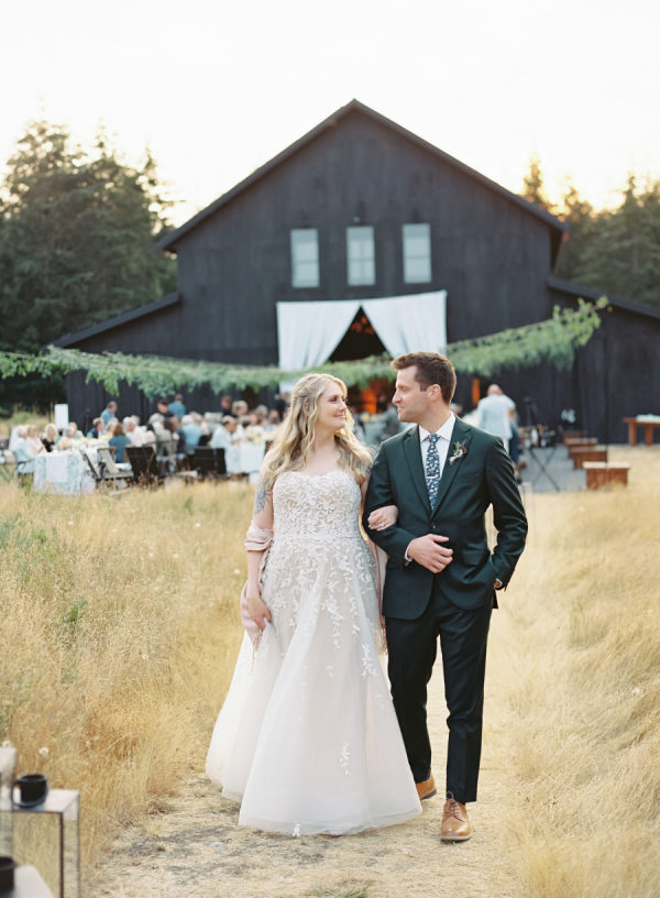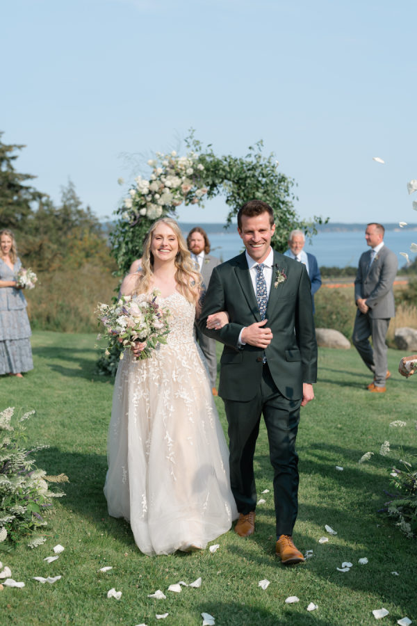 All the flowers and foliage used in the wedding were sourced from Washington state, with an emphasis on floral types that could be naturally found on San Juan Island. This made the florals feel more organic, and made their décor more sustainable since their floral wasn’t being flown in from around the world, increasing their carbon footprint. It also supports local growers, which was something Ginny & Adam felt strongly about. At the ceremony, we wanted the flowers to feel natural and almost as if they were plucked right from the venue grounds. The idea was to keep things simple and let the focus be on Ginny and Adam and the gorgeous natural background of the Salish Sea. Cocktail hour was fairly minimal with floral décor, only adding in petite cocktail table arrangements and a light dusting of greenery and blooms on the frame above the bar. We wanted the lush garden to speak for itself, as it is a naturally stunning part of the property at Saltwater Farm. For the reception, we kept the floral on the guest dining tables streamlined by using small bud vases scattered down the tables. We wanted it to look like a polished version of simply picking the flowers right from a garden and adding them to the dinner table. We used single-type arrangements in each bud vase to create more interest on the table and to let the beauty of each flower type really sing. Then, to help make the outdoor dining area feel more intimate, we suspended rope with greenery in a crisscross pattern above the dinner tables. This brought the “ceiling” down and made the space feel really cozy and intimate. Inside the barn, our florist constructed trees that were attached to the vertical wooden beams. To reduce our impact on the environment, these “trees” were lovingly made from used tree branches that were upcycled from another wedding the florist had a few weeks earlier. A vine called smilax was then draped along the branches to give them their leafy, tree-like appearance. We also draped smilax along vertical fishing line as part of the band backdrop, pinning it to the white drapery behind them. The ceremony florals were also repurposed along the front of the stage to create a beautiful floral display for dancing that didn’t add to our environmental impact.