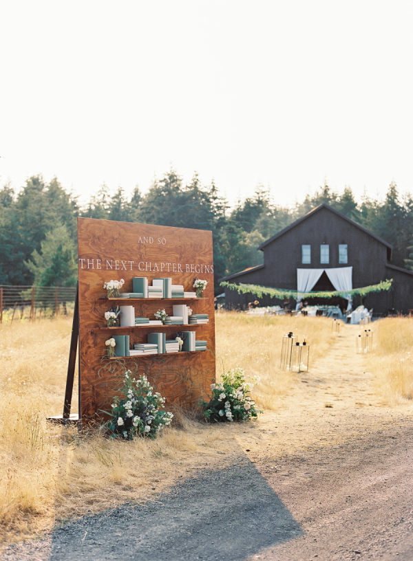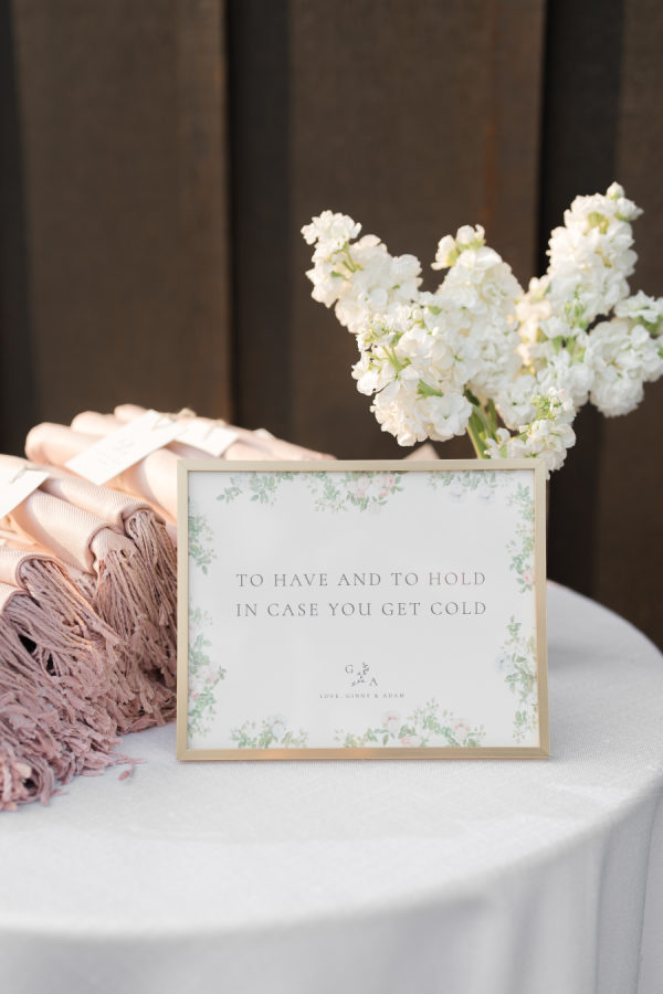 Since they aren’t cake people, their sweet station was an elaborate dessert bar that offered vegan and gluten-free items to accommodate all their guests. Interactive stations were also scattered throughout the barn to entertain guests, including a customized crossword puzzle about the couple, a pashmina station to keep guests warm near the fire pits, and a Polaroid guestbook station.