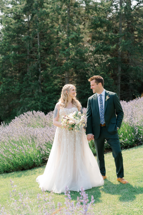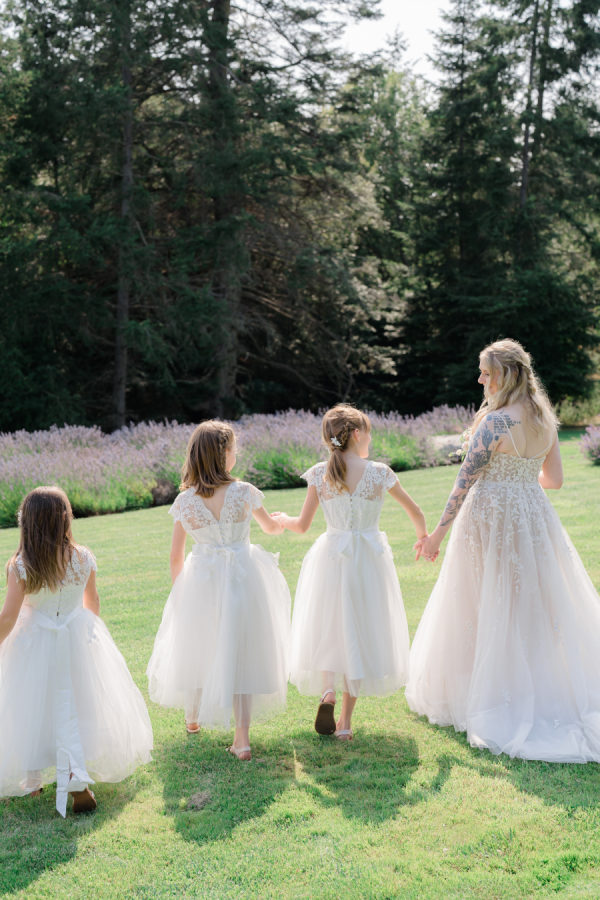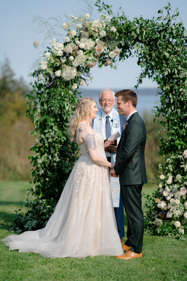 From the couple: Ginny and Adam met thanks to the wonders of 2010’s-era online dating! While the first thing that drew Ginny to Adam was a picture of his handsome face and kind eyes, once they started talking, she was quickly attracted to his sense of humor, his thoughtfulness, and his passion for his work with disadvantaged youth. Adam was intrigued by Ginny’s beauty, emotional honesty, compassion, playfulness, and her obvious love for every living soul she encountered in her life. They spent hours talking and messaging back and forth. His compassionate curiosity shone through his words, and she felt herself falling in love with him before they had even met in person! Their first date was at the famous JP Licks in Boston, which was appropriate,e seeing as they both love ice cream. Adam even grew up scooping ice cream at a store near his hometown of Reading, Massachusetts. It was raining for their date, but they still decided to take a walk along the bike path. Adam held Ginny’s umbrella above her head as the rain fell softly, and she remembered looking up at him, smiling. Out of nowhere, an unbidden thought entered Ginny’s consciousness – “I am going to marry this man one day.” Having spent quite some time going on first (and only) dates through OKCupid, she figured it was a ridiculous thought. But over the next seven days, they went on five dates, and that was it. She was hooked. It took a little more time for Adam to get on the same page, but very early on,n he realized he had never found someonwhomho he enjoyed being around so much, who was so sweet and genuine, so easy to care for. On their fifth anniversary, Adam got down on one knee on that same bike path and asked Ginny to spend the rest of her life with him. Luckily for Adam, Ginny was willing to wait until he realized what she had already realized in that same spot five years before! In the summer of 2023, they made the decision to move from Boston to Seattle and start a new life together. Ginny and Adam both love the Pacific Northwest and were so excited to share their vows in front of their closest family and friends at Saltwater Farm on San Juan Island.
