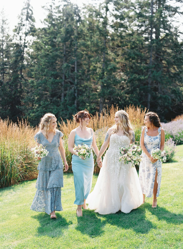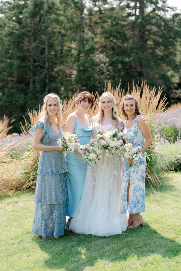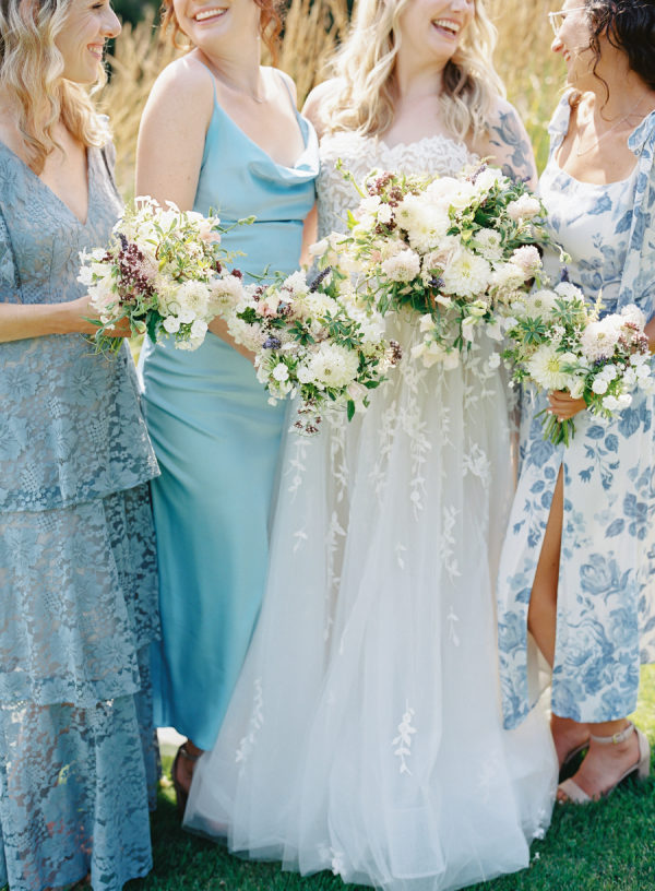 Ginny’s bridesmaids wore an assortment of ready-to-wear gowns in coordinating, but different patterns of blue and white. She wanted her girls to feel comfortable and able to wear these dresses again in the future.