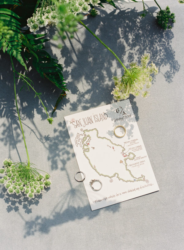 Family and friends are of huge importance to this couple, so utilizing their community of loved ones to help make special touches come to life was a must for them. One instance of this was that their family friend created an illustrated San Juan Island map and venue map that were included in their wedding invitation suites. The maps noted where each of the wedding elements was taking place and gave activity suggestions throughout the island for the days leading up to the wedding. This will be a special keepsake from their wedding day that they can cherish forever.