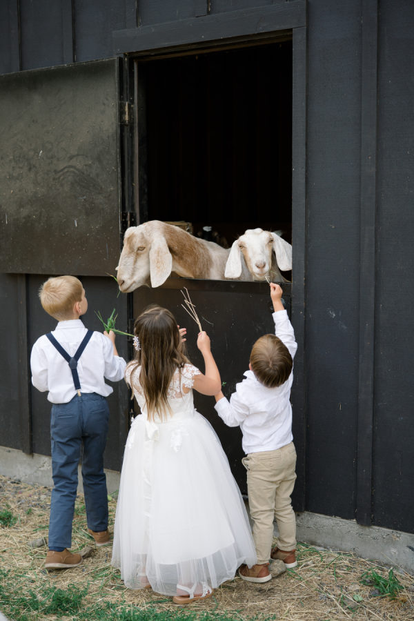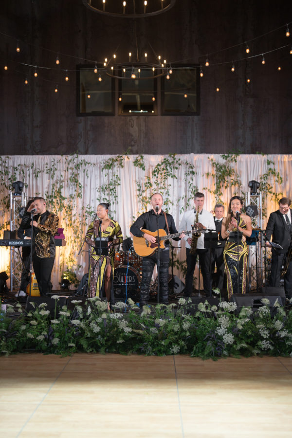 Guests were dropped off at Saltwater Farm by the Jolly Trolley, a vintage trolley service on San Juan Island. Upon arrival, guests were greeted by sparkling wine and the stunning scenery of the venue while they mingled outside the Inn, next to the ceremony meadow. Once they were called to their seats, they enjoyed a heartfelt ceremony led by Adam’s father. After they said their “I Do’s,” guests threw petals as Ginny & Adam recessed down the aisle and made their way upstairs to sign their marriage license. Their cocktail hour took place in the garden, which was a short walk from the ceremony site. They let the natural beauty of the space take center stage, and only accented it with some fun patterned linens that coordinated with the linens used for the reception dining tables. Interactive food displays were a fun highlight for guests, including a live oyster shucking station and a stunning cheese & charcuterie display. Signature cocktails were pre-batched and beautifully displayed on the venue’s large built-in bar so guests could quickly grab their delicious beverage of choice as soon as they arrived in the garden from the ceremony. Guests then headed to the reception, where they dined al fresco in front of the barn. Once the toasts finished and dinner ended, guests were invited inside the event barn for dancing by an electrifying 11-piece band from Vancouver, Canada, who played the most amazing high-energy sets all night long.