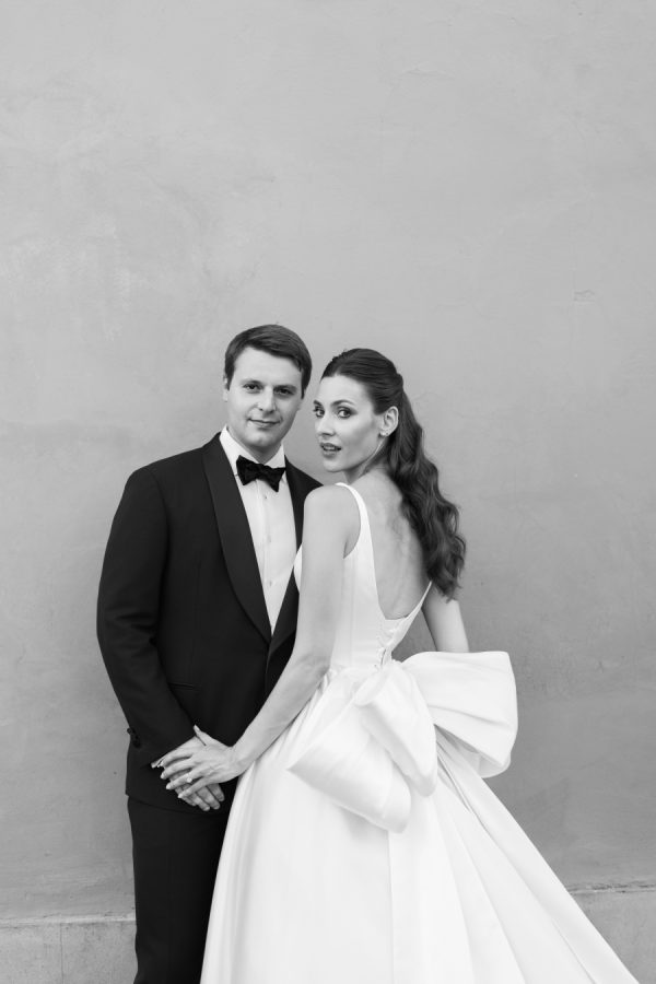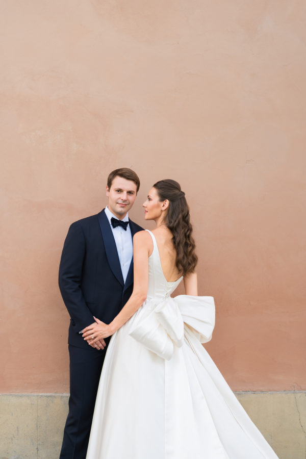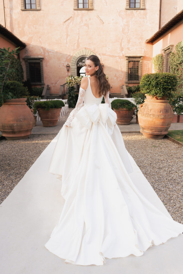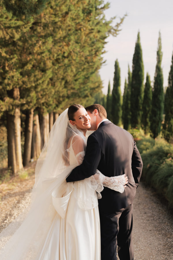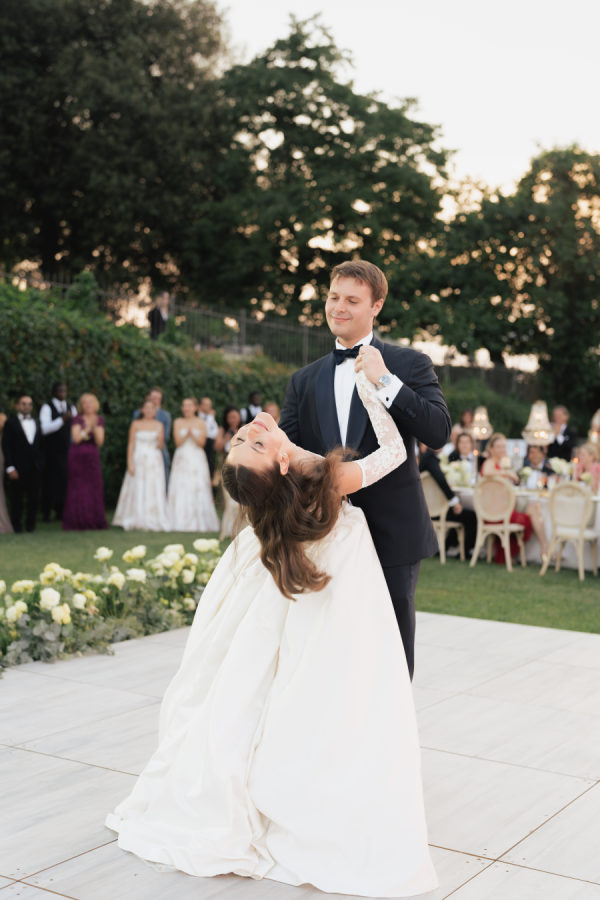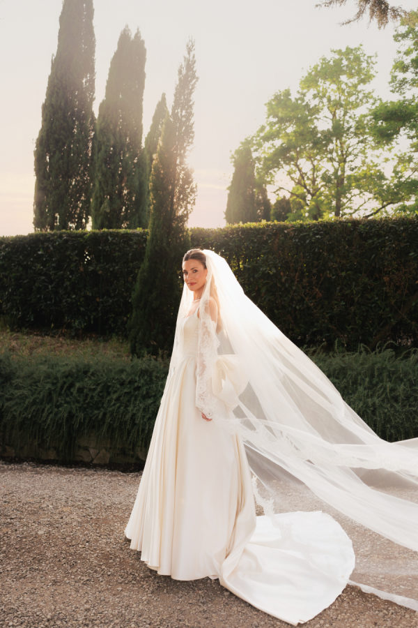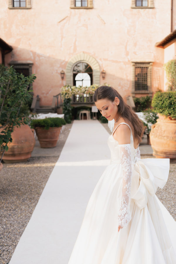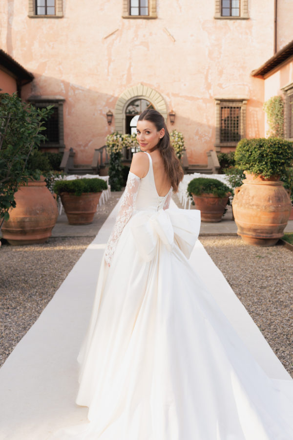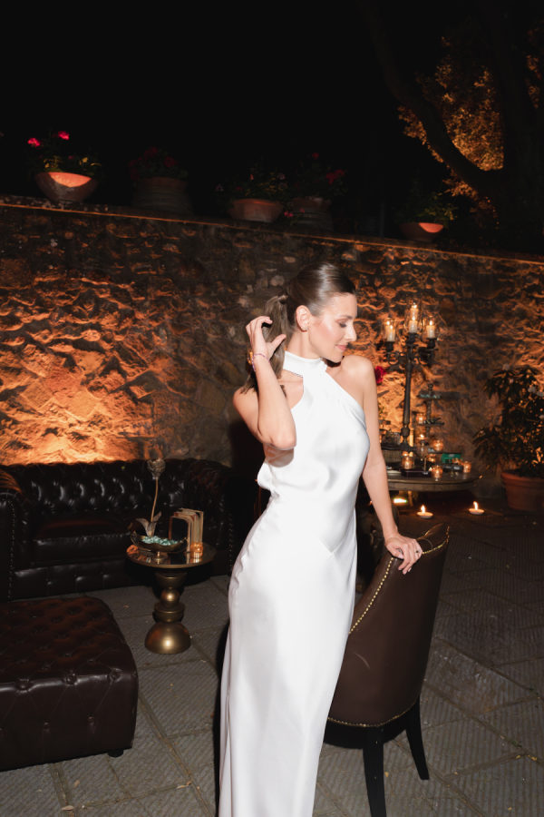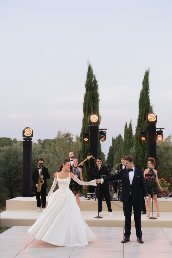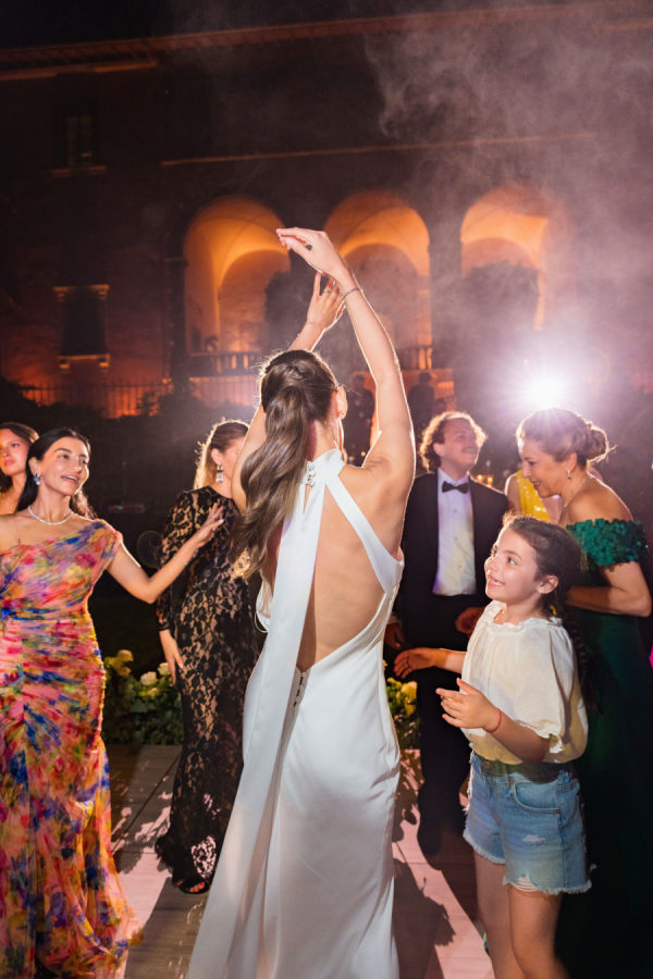 Leticia wore a dramatic Pnina Tornai ball gown with a statement bow — a bold and elegant choice that wowed guests and, most importantly, her groom. “Everyone loved my dress,” she laughs. “Including my fiancé, who had to carry the heavy gown all the way from New York to Tuscany!” Allan agreed it was all worth it the moment he saw her. The gown’s dramatic flair made their first dance feel like a scene from a movie, twirling across the floor under the open sky. During dinner, Leticia changed into a sleek halter gown by Galia Lahav—an effortlessly chic silhouette that allowed her to move, dance, and celebrate the night in comfort and style. The satin fabric glowed softly under candlelight, and the open back and sculpted fit added a modern edge to her bridal look. It was the perfect contrast to the dramatic ball gown she wore earlier, showing off a second side of her bridal personality: relaxed, radiant, and ready to party.