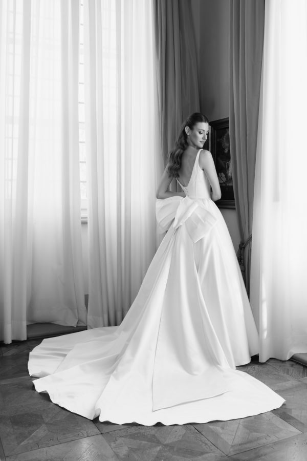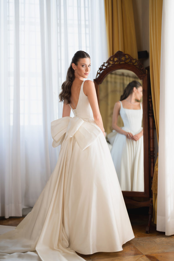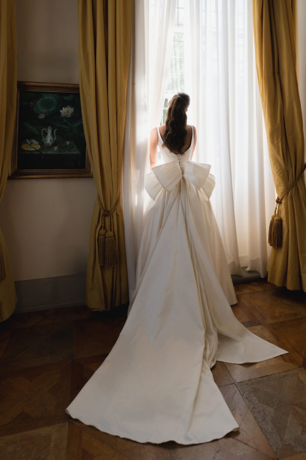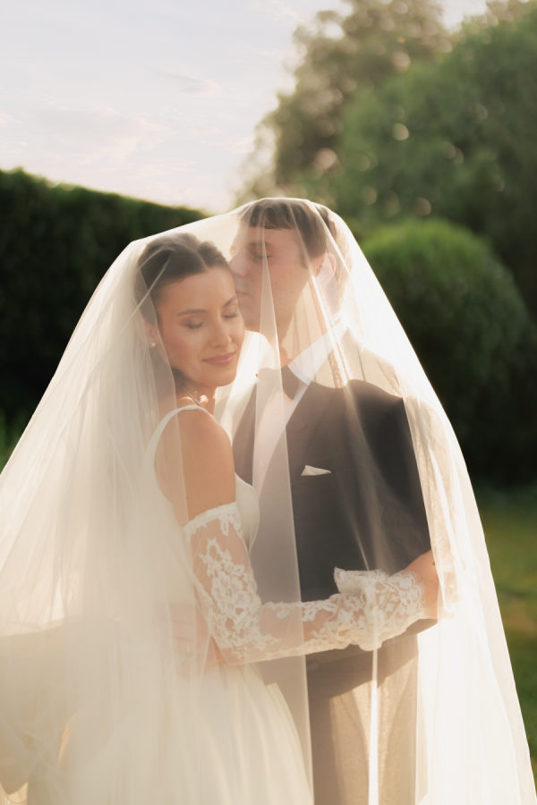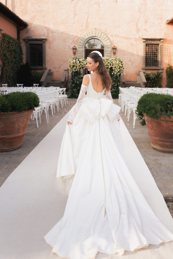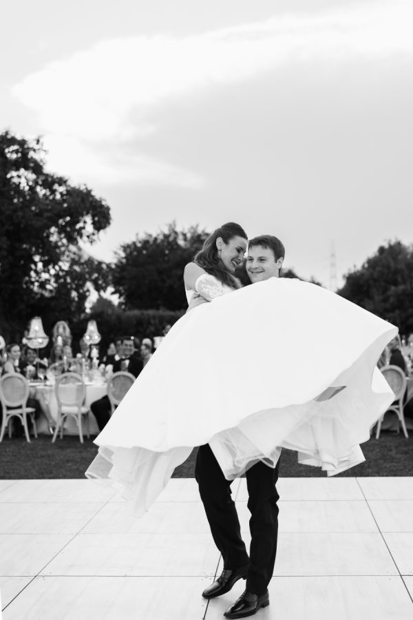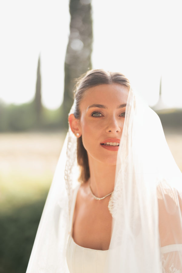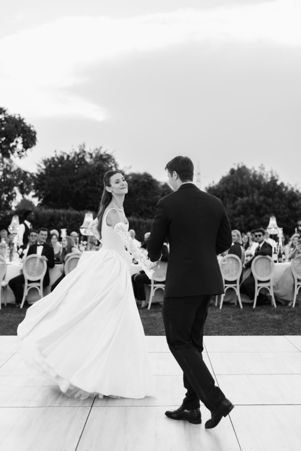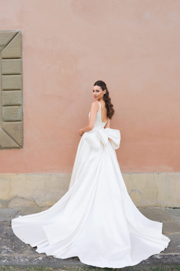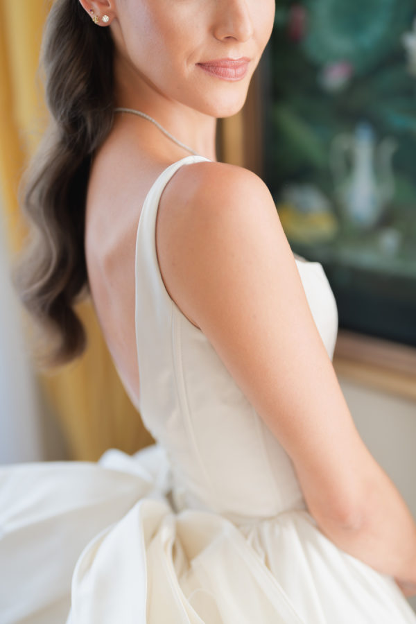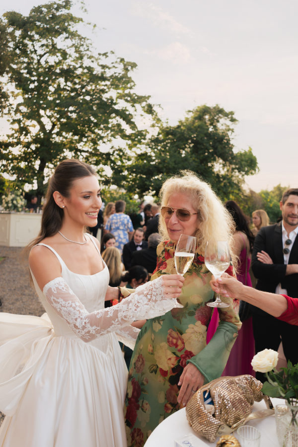 Leticia wore a dramatic Pnina Tornai ball gown with a statement bow — a bold and elegant choice that wowed guests and, most importantly, her groom. “Everyone loved my dress,” she laughs. “Including my fiancé, who had to carry the heavy gown all the way from New York to Tuscany!” Allan agreed it was all worth it the moment he saw her. The gown’s dramatic flair made their first dance feel like a scene from a movie, twirling across the floor under the open sky. During dinner, Leticia changed into a sleek halter gown by Galia Lahav—an effortlessly chic silhouette that allowed her to move, dance, and celebrate the night in comfort and style. The satin fabric glowed softly under candlelight, and the open back and sculpted fit added a modern edge to her bridal look. It was the perfect contrast to the dramatic ball gown she wore earlier, showing off a second side of her bridal personality: relaxed, radiant, and ready to party.