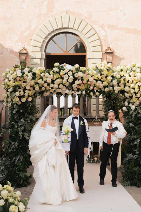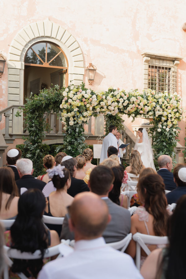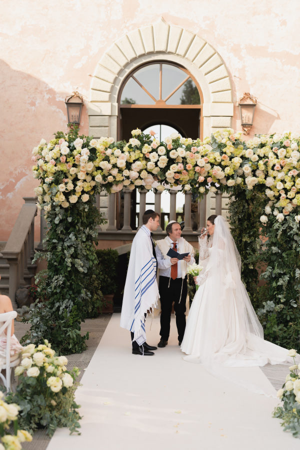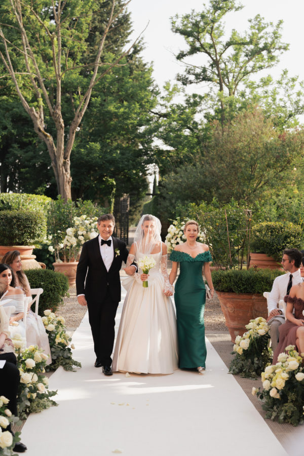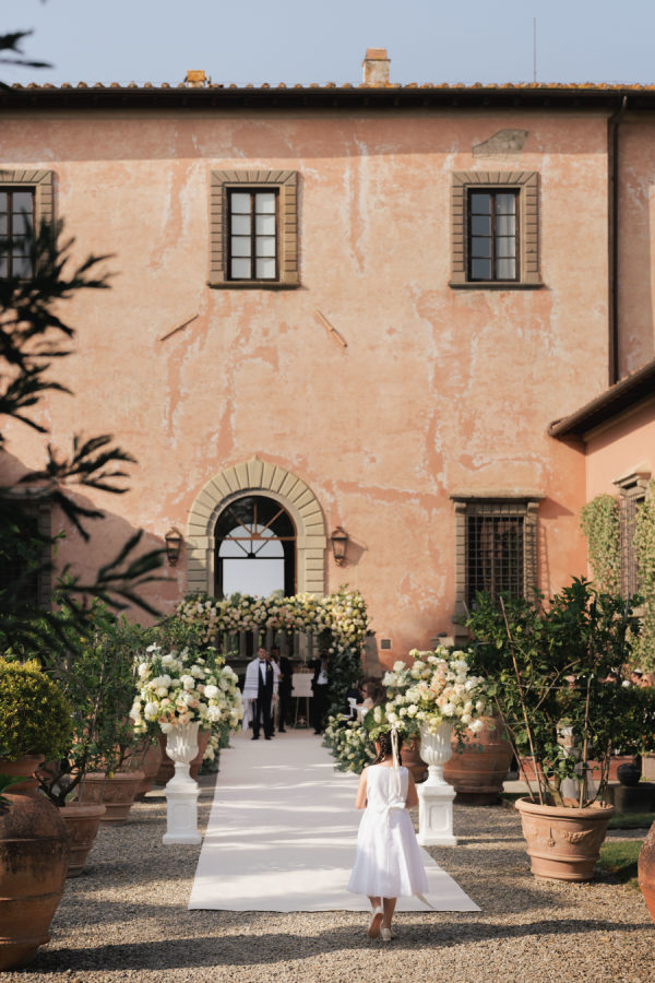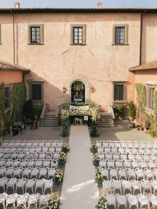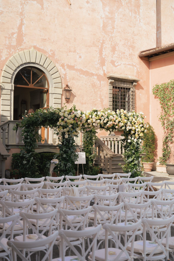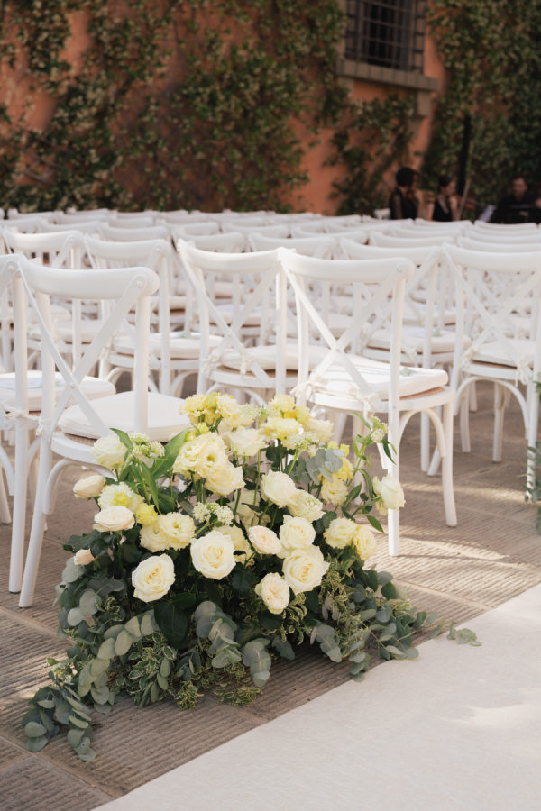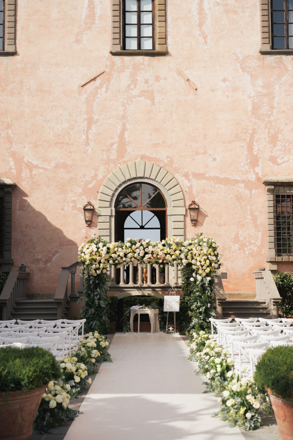 [field title=”Florals & Decor”]The floral and décor design was a true extension of the romantic, timeless feel of the day. Cream, white, and soft blush roses spilled generously along the aisle, while lush greenery framed the entrance to Villa Mangiacane, drawing all eyes to the historic façade where the ceremony took place.