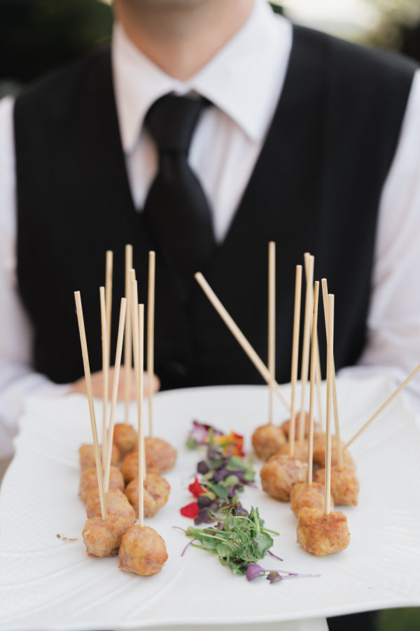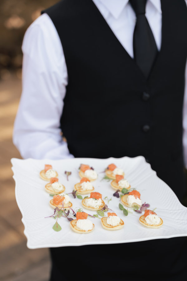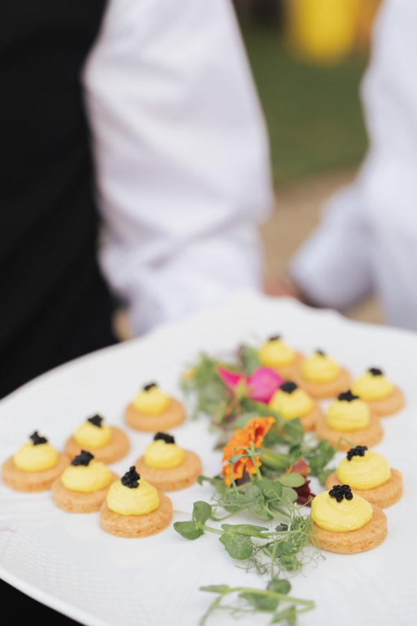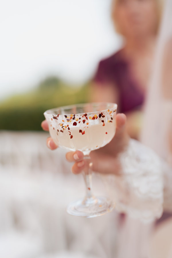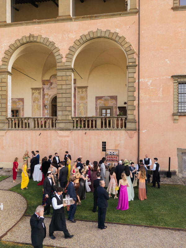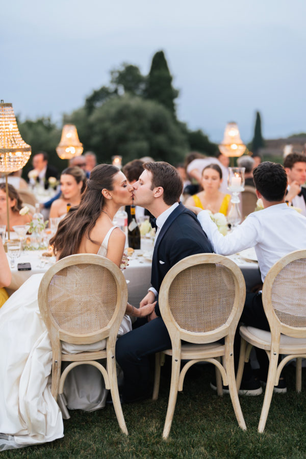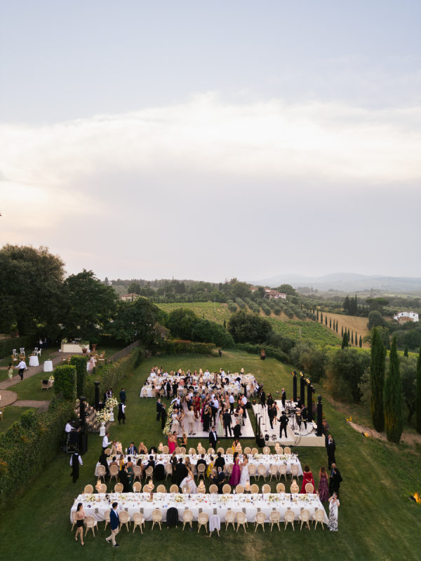 The evening began with a beautiful cocktail hour featuring signature his-and-hers drinks: a spicy margarita for the bride and a gin basil gimlet for the groom. Guests sipped and mingled as the sun dipped behind the Tuscan hills, setting the tone for an evening filled with joy, elegance, and unforgettable flavor. Galateo Catering brought the culinary vision to life with a menu that was as refined as it was delicious. A curated selection of ten hors d’oeuvres was passed around, each a small masterpiece. Guests delighted in brioches with rosemary paté, smoked salmon blinis, warm bignet mignon with truffle and cheese, and mini quiches with Greek feta, olives, and rosemary. Delicate tartlets of veal tonné with Pantelleria capers and quail egg foam with truffle caviar offered rich, savory notes, while crispy fried sage leaves and zucchini flowers added a touch of golden crunch. Rounding out the bites were spicy veal meatballs and mini ravioli stuffed with burrata and pesto—a perfect blend of Tuscan tradition and refined indulgence. For dinner, guests started with a vibrant seabass and salmon ceviche with grapefruit and vegetables, while the vegetarian option featured a delicate tomato water with a burrata quenelle. The second course was a standout: fresh paccheri pasta with saffron cream, confit Pachino tomatoes, and asparagus tips — the perfect summer dish, light yet full of flavor. For the main course, guests chose between tender veal fillet or seabass with seasonal vegetables, while vegetarians were served a comforting and elevated eggplant parmigiana. The meal was complemented by two exceptional wines from the Antinori family estates: the Conte della Vipera 2023 from Castello della Sala in Umbria IGT, and the Botrosecco 2022 from Le Mortelle Estate in Maremma Toscana DOC — selections that perfectly captured the spirit and sophistication of the evening.