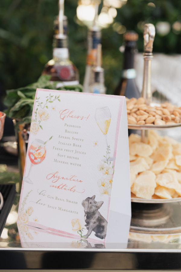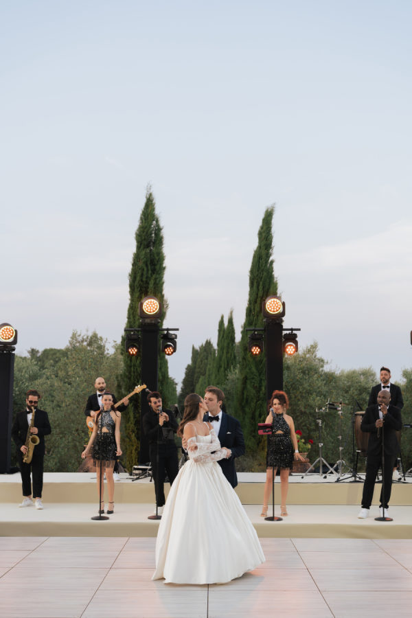 [field title=”Readings, Ceremony Music, Reception Songs”]The entertainment flowed beautifully throughout the day, setting the perfect tone for each part of the celebration. A string quartet played during the ceremony, filling the courtyard with emotion as Leticia walked down the aisle to Hallelujah. They continued into cocktail hour with a mix of classical and contemporary favorites, including a moving rendition of Yellow by Coldplay. As the sun began to set, the incredibly talented Assya Live Band brought the dinner to life with a dynamic setlist featuring hits from ABBA, Queen, and other timeless crowd-pleasers. After dinner, guests were invited into the villa’s wine cellar, where the DJ took over and kept the dance floor full well into the night.[/field]