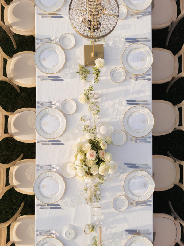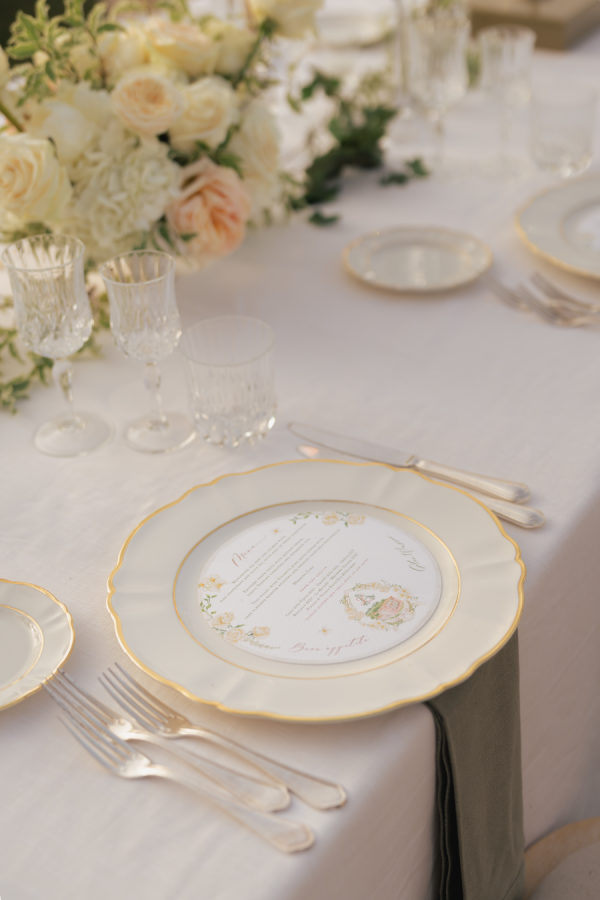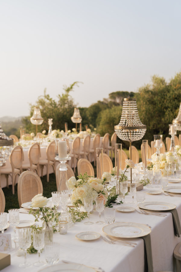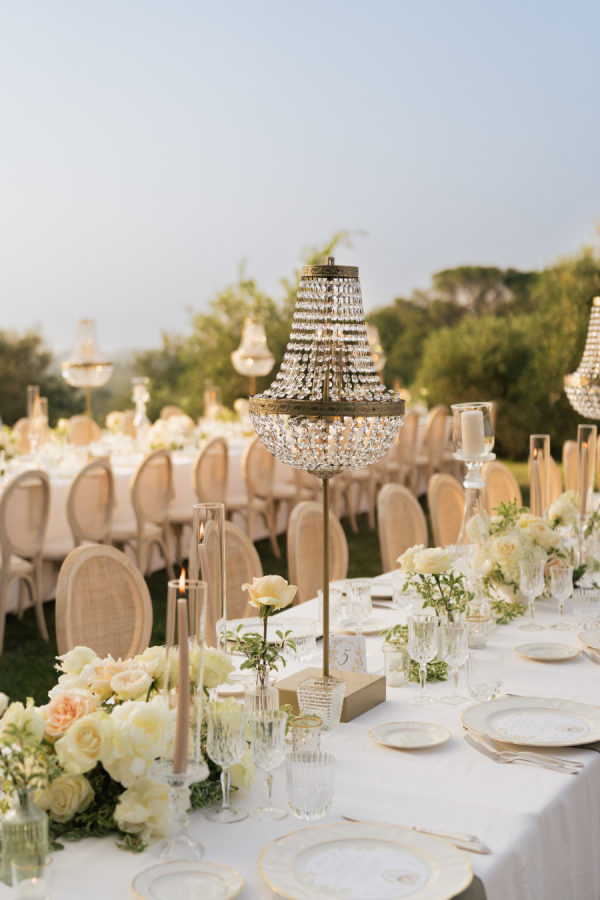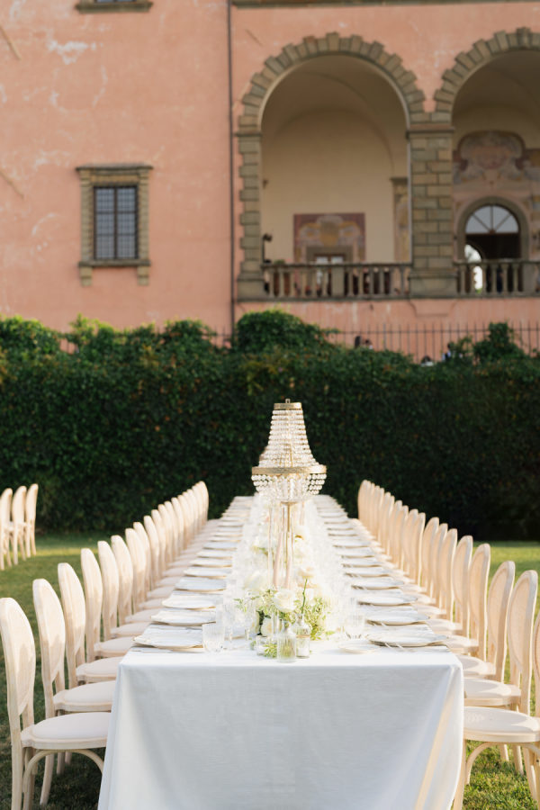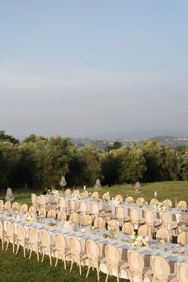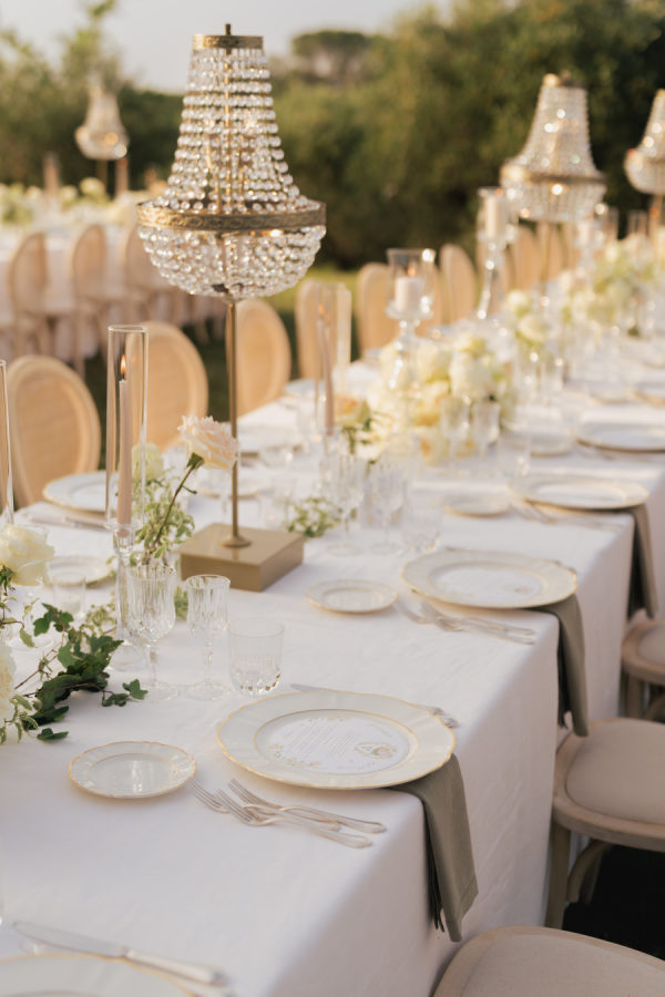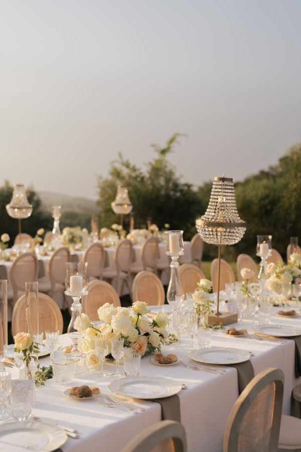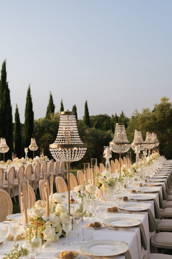 Oversized arrangements in classic urns added elegance, while crystal chandeliers floated above the long reception tables, casting a warm glow as the sun set over the Tuscan hills. Tables were dressed in crisp white linens with soft sage-green napkins, gold-rimmed glassware, and delicate floral runners, creating a setting that felt both regal and intimate.