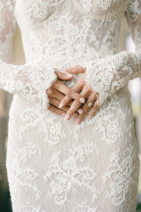 Andi wore the Moe gown by Dana Harel — a fitted, long-sleeve design in intricate sauté lace. With its high-collar neckline and elegant open back, the gown perfectly balanced modern sophistication with vintage-inspired romance. The result was a look that felt both timeless and effortlessly fashion-forward.