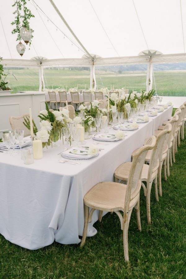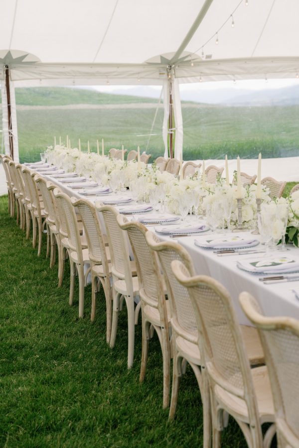The couple embraced a timeless, neutral palette that harmonized effortlessly with Sage Lodge’s natural surroundings. Rather than adhering to a strict color scheme, they favored a refined mix of warm ivory, soft neutrals, and muted greens. The result was an elegant, organic aesthetic that felt cohesive yet relaxed—perfectly in tune with the landscape’s understated luxury.