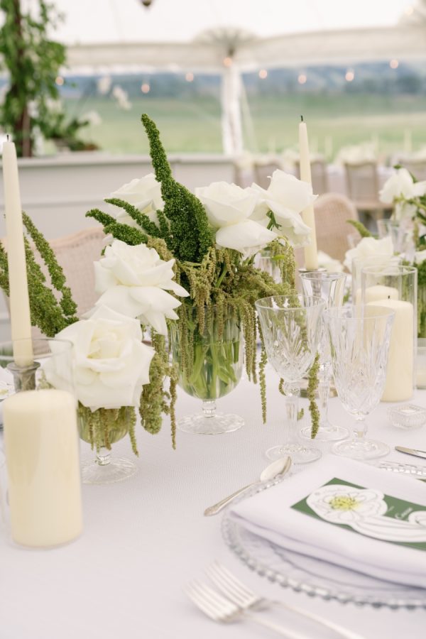 Florals were lush but restrained — a textured mix of ivory blooms, soft garden roses, and abundant greenery for a natural, refined feel. Arrangements emphasized movement and form, with low centerpiece clusters for intimate tabletops and sweeping installations at the ceremony to frame the couple’s vows.
